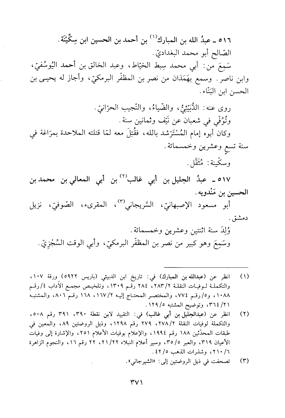 516- عَبْد اللَّه بن المبارك [1] بن أَحْمَد بن الحسين ابن سكّينة.