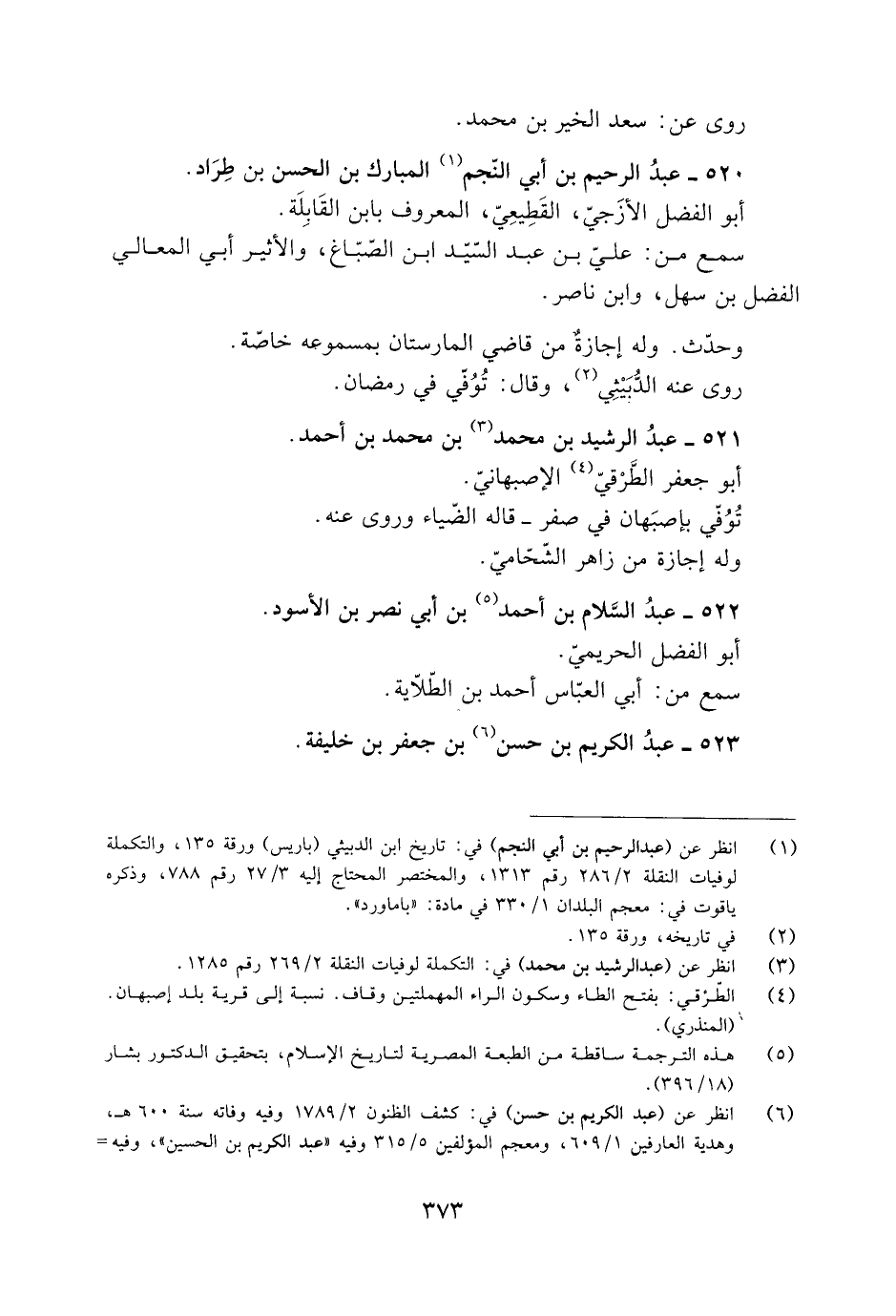 [1] انظر عن (عبد الرحيم بن أبي النجم) في: تاريخ ابن الدبيثي (باريس) ورقة 135، والتكملة لوفيات النقلة 2/ 286 رقم 1313، والمختصر المحتاج إليه 3/ 27 رقم 788، وذكره ياقوت في: معجم البلدان 1/ 330 في مادة: «باماورد» .