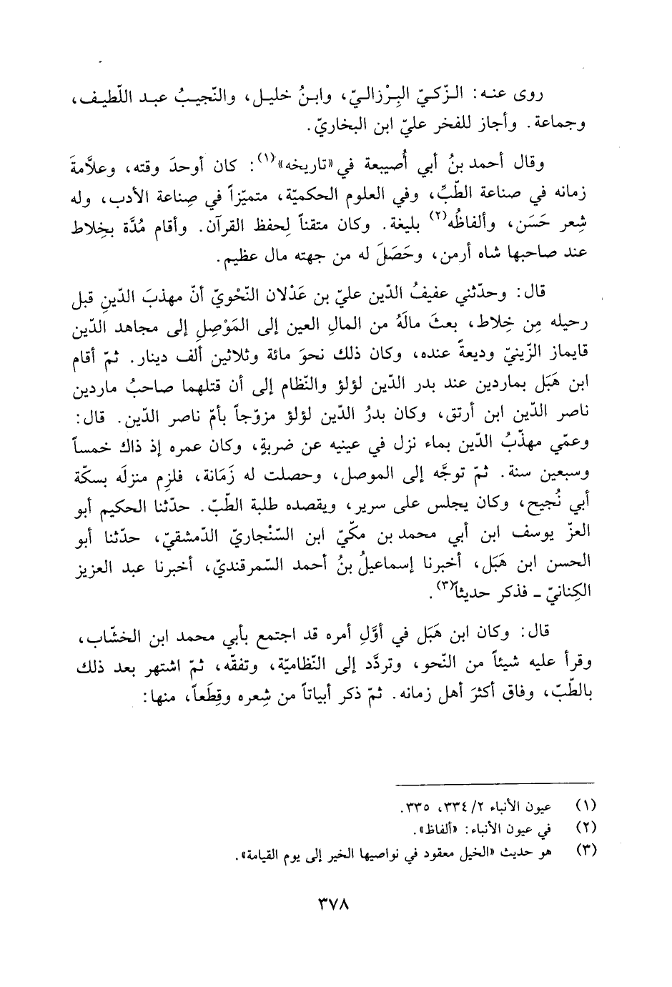 وعمّي مهذّب الدّين بماء نزل في عينيه عن ضربة، وكان عمره إذ ذاك خمسا وسبعين سنة. ثمّ توجّه إلى الموصل، وحصلت له زمانة، فلزم منزله بسكّة أبي نجيح، وكان يجلس على سرير، ويقصده طلبة الطّبّ. حدّثنا الحكيم أبو العزّ يوسف ابن أبي محمد بن مكّيّ ابن السّنجاريّ الدّمشقيّ، حدّثنا أبو الحسن ابن هبل، أخبرنا إسماعيل بن أحمد السّمرقنديّ، أخبرنا عبد العزيز الكنانيّ- فذكر حديثا [3] .
