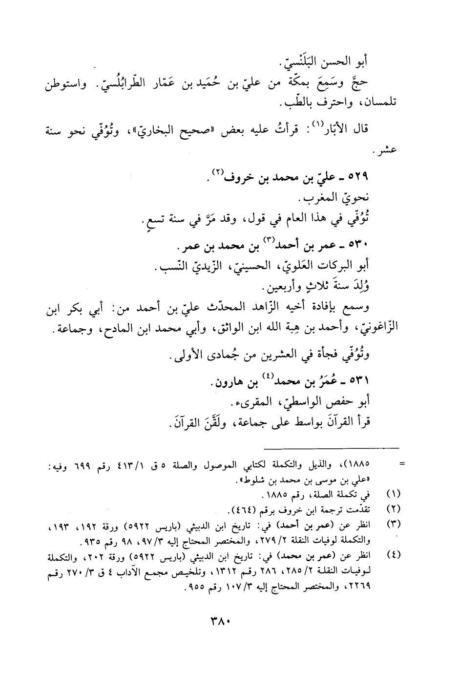 [3] انظر عن (عمر بن أحمد) في: تاريخ ابن الدبيثي (باريس 5922) ورقة 192، 193، والتكملة لوفيات النقلة 2/ 279، والمختصر المحتاج إليه 3/ 97، 98 رقم 935.
