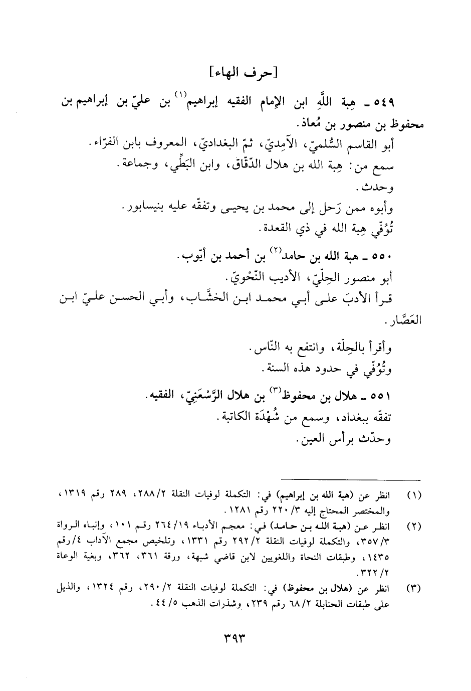 [2] انظر عن (هبة الله بن حامد) في: معجم الأدباء 19/ 264 رقم 101، وإنباه الرواة 3/ 357، والتكملة لوفيات النقلة 2/ 292 رقم 1331، وتلخيص مجمع الآداب 4/ رقم 1435، وطبقات النحاة واللغويين لابن قاضي شبهة، ورقة 361، 362، وبغية الوعاة 2/ 322.