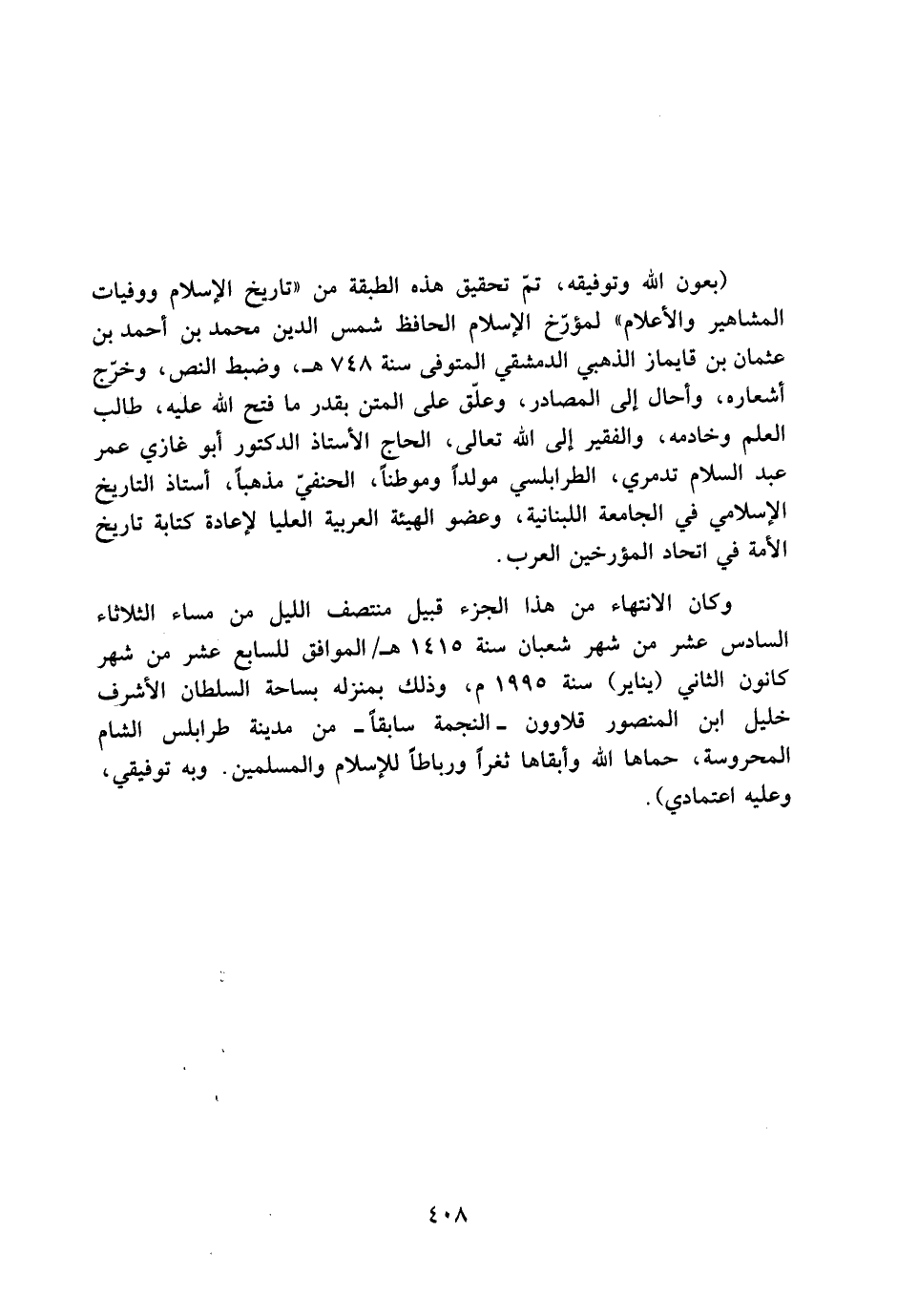 (بعون الله وتوفيقه، تمّ تحقيق هذه الطبقة من «تاريخ الإسلام ووفيات المشاهير والأعلام» لمؤرّخ الإسلام الحافظ شمسُ الدين مُحَمَّدُ بْنُ أَحْمَد بْن عثمان بن قايماز الذهبي الدمشقيّ المتوفى سنة 748 هـ، وضبط النص، وخرّج أشعاره، وأحال إلى المصادر، وعلّق على المتن بقدر ما فتح الله عليه، طالب العلم وخادمه، والفقير إلى الله تعالى، الحاج الأستاذ الدكتور أبو غازي عمر عبد السلام تدمري، الطرابلسي مولدا وموطنا، الحنفيّ مذهبا، أستاذ التاريخ الإسلامي في الجامعة اللبنانية، وعضو الهيئة العربية العليا لإعادة كتابة تاريخ الأمة في اتحاد المؤرخين العرب.