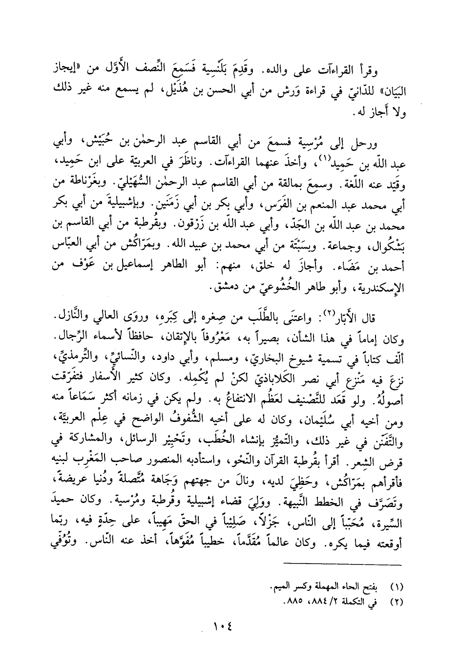 ألّف كتابا في تسمية شيوخ البخاريّ، ومسلم، وأبي داود، والنَّسَائِي، والتّرمذيّ، نزعَ فيه مَنْزع أَبِي نصر الكلاباذيّ لكن لم يُكْمله. وَكَانَ كثير الْأسفار فتفرّقت أصوله. ولو قعد للتَّصنيف لعَظُم الانتفاع بِهِ. ولم يكن في زمانه أكثر سماعا منه ومن أخيه أبي سُلَيْمَان، وَكَانَ لَهُ عَلَى أخيه الشُّفوف الواضح في عِلْم العربيّة، والتَّفنن في غير ذَلِكَ، والتّميّز بإنشاء الخُطب، وتَحْبير الرسائل، والمشاركة في قرض الشعر. أقرأ بقُرْطُبَة القرآن والنّحو، واستأدبه المنصور صاحب المغرب لبنيه فأقرأهم بمرّاكش، وحظي لديه، ونال من جهتهم وجاهة مُتَّصلة ودُنيا عريضة، وتصرّف في الخطط النَّبيهة. ووليَ قضاء إشبيلية وقرطبة ومرسية. وكان حميد السّيرة، مُحبّبًا إلى النَّاس، جَزْلًا، صَلِيبًا في الحقّ مَهِيبًا، عَلَى حِدَّةٍ فيه، ربّما أوقعته فيما يكره. وَكَانَ عالما مُقدَّمًا، خطيبا مُفوَّهًا، أخذ عنه النّاس. وتوفّي