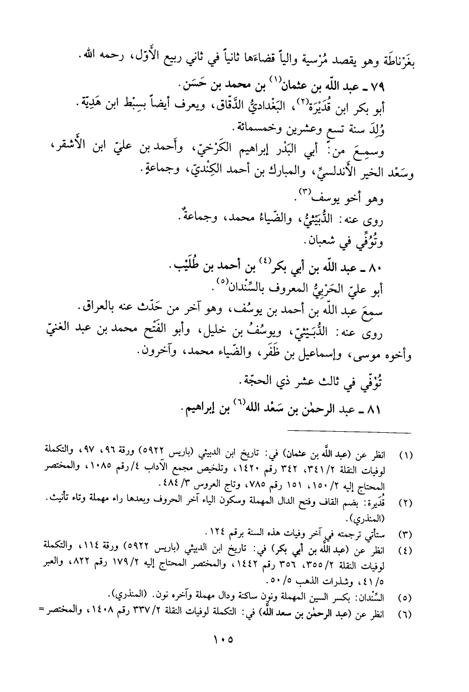 [1] انظر عن (عبد الله بن عثمان) في: تاريخ ابن الدبيثي (باريس 5922) ورقة 96، 97، والتكملة لوفيات النقلة 2/ 341، 342 رقم 1420، وتلخيص مجمع الآداب 4/ رقم 1085، والمختصر المحتاج إليه 2/ 150، 151 رقم 785، وتاج العروس 3/ 484.