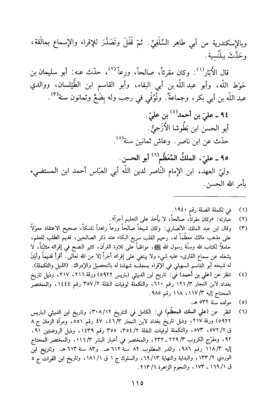 [4] انظر عن (علي بن أحمد) في: تاريخ ابن الدبيثي (باريس 5922) ورقة 216، 217، وذيل تاريخ بغداد لابن النجار 3/ 121 رقم 610، والتكملة لوفيات النقلة 2/ 357 رقم 1444، والمختصر المحتاج إليه 3/ 117، 118 رقم 985.