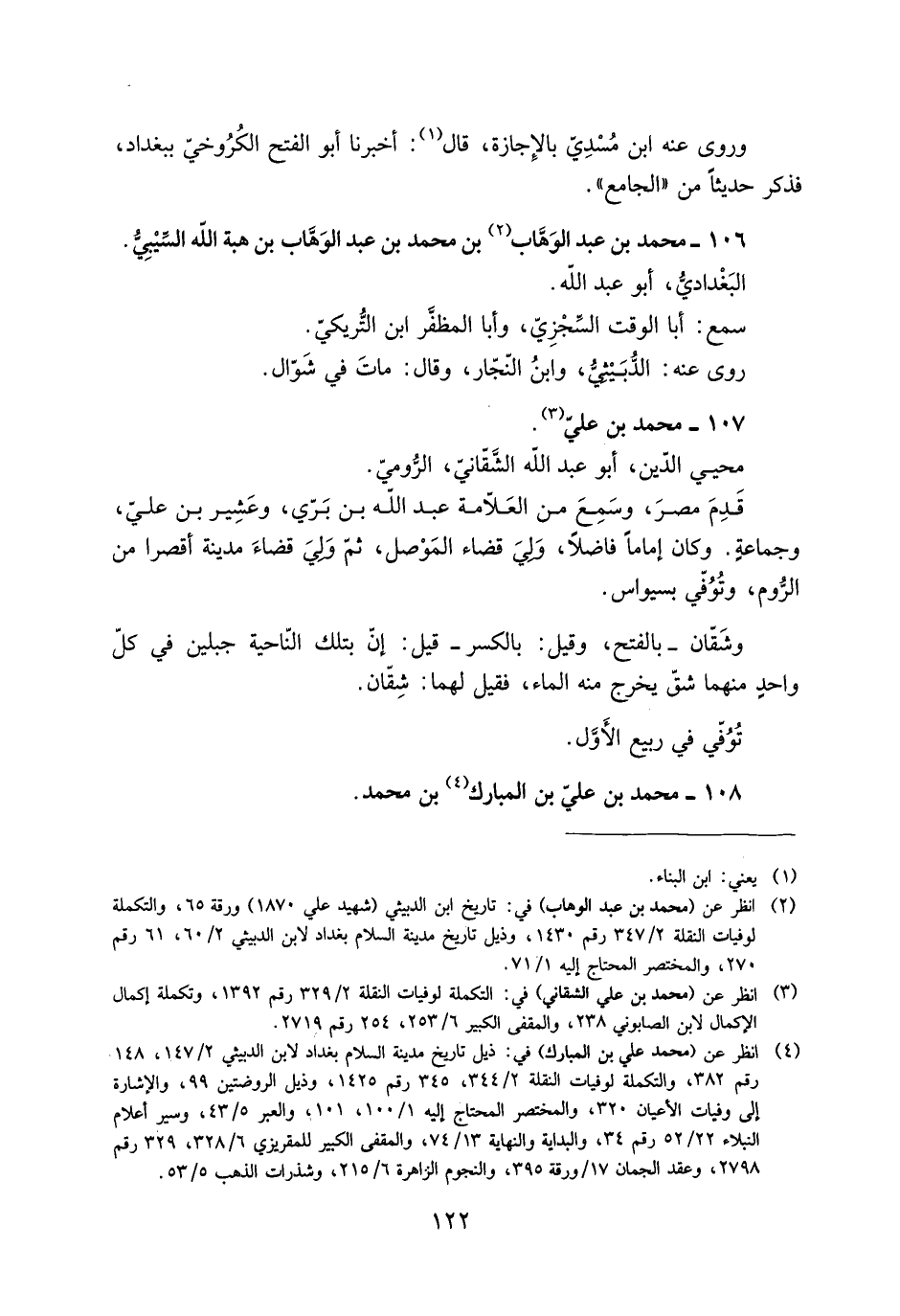 [2] انظر عن (محمد بن عبد الوهاب) في: تاريخ ابن الدبيثي (شهيد علي 1870) ورقة 65، والتكملة لوفيات النقلة 2/ 347 رقم 1430، وذيل تاريخ مدينة السلام بغداد لابن الدبيثي 2/ 60، 61 رقم 270، والمختصر المحتاج إليه 1/ 71.