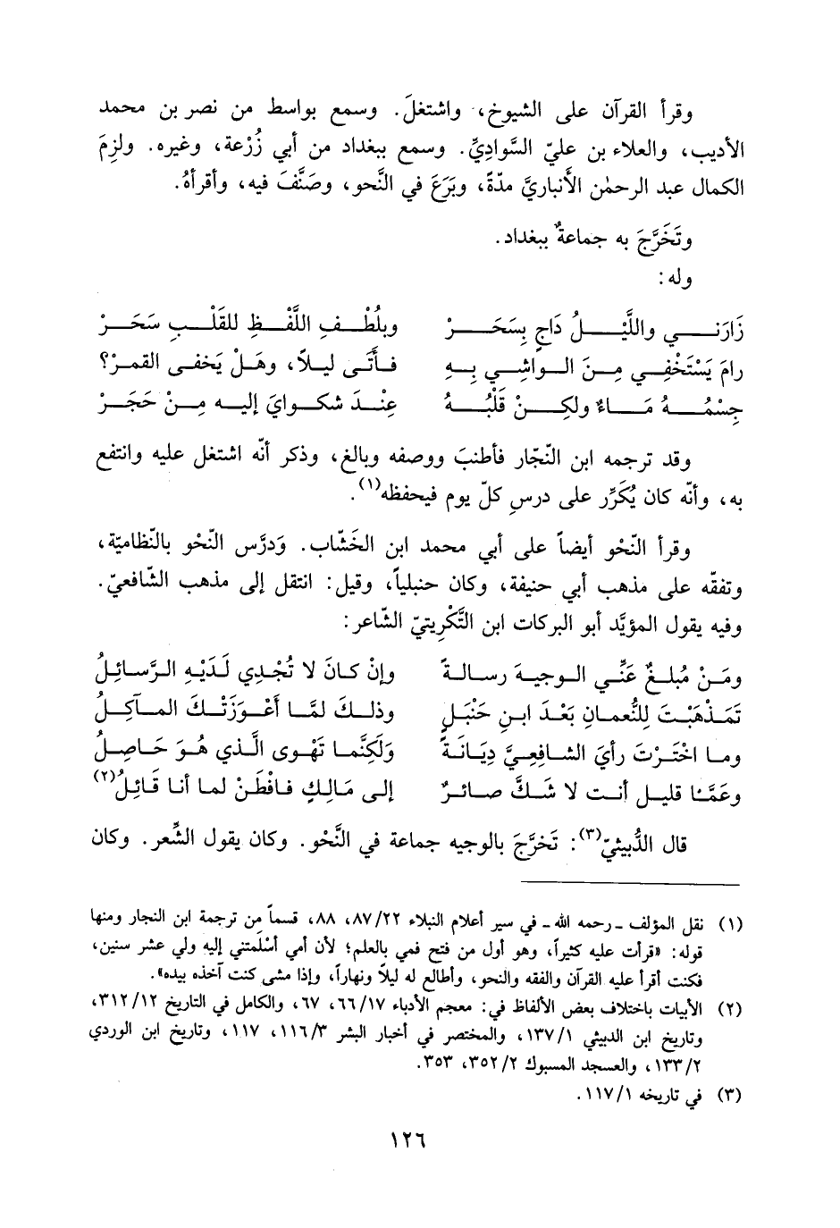 [1] نقل المؤلف- رحمه الله- في سير أعلام النبلاء 22/ 87، 88، قسما من ترجمة ابن النجار ومنها قوله: «قرأت عليه كثيرا، وهو أول من فتح فمي بالعلم، لأن أمي أسلمتني إليه ولي عشر سنين، فكنت أقرأ عليه القرآن والفقه والنحو، وأطالع له ليلا ونهارا، وإذا مشى كنت آخذه بيده» .