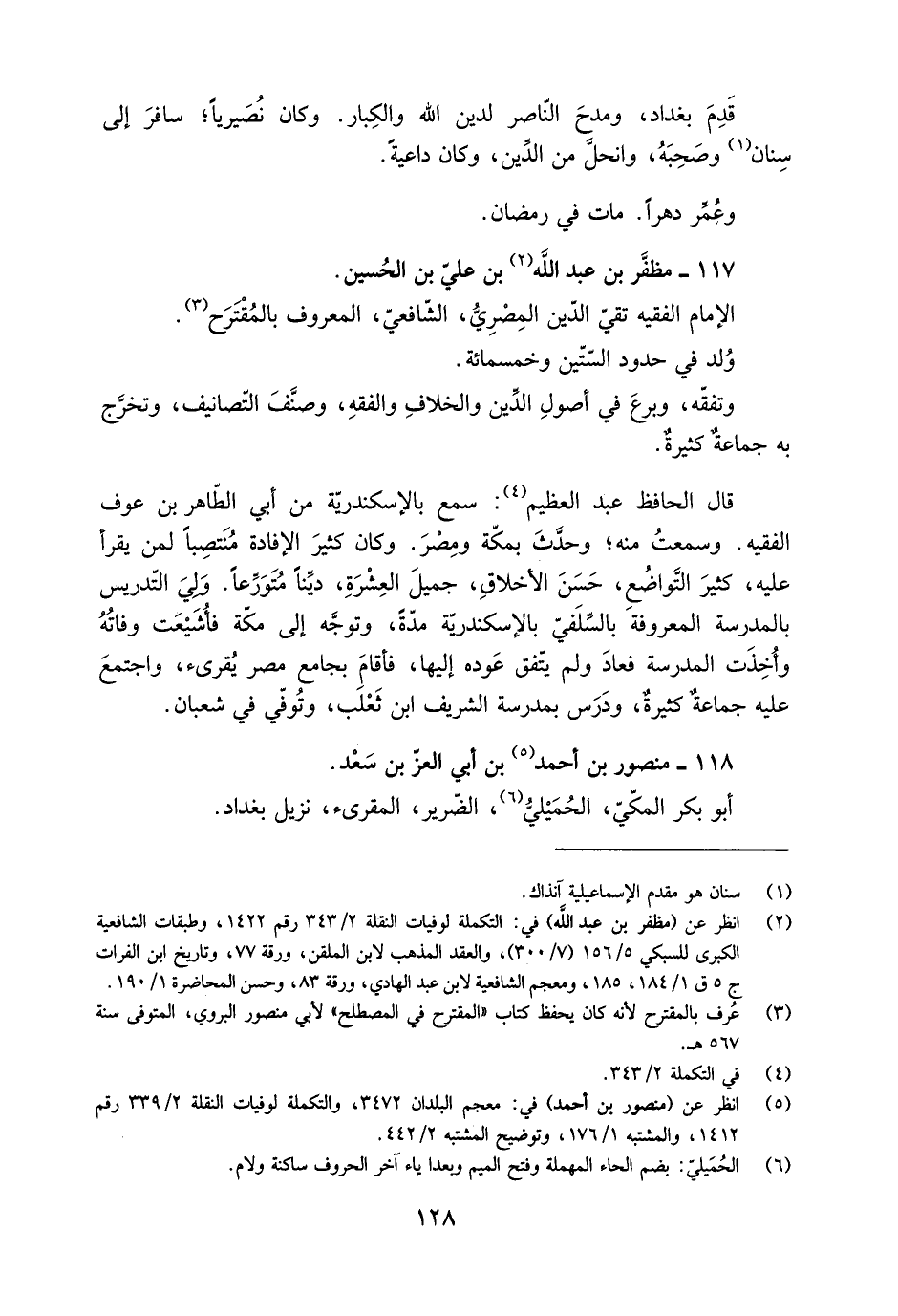 [2] انظر عن (مظفر بن عبد الله) في: التكملة لوفيات النقلة 2/ 343 رقم 1422، وطبقات الشافعية الكبرى للسبكي 5/ 156 (7/ 300) ، والعقد المذهب لابن الملقن، ورقة 77، وتاريخ ابن الفرات ج 5 ق 1/ 184، 185، ومعجم الشافعية لابن عبد الهادي، ورقة 83، وحسن المحاضرة 1/ 190.