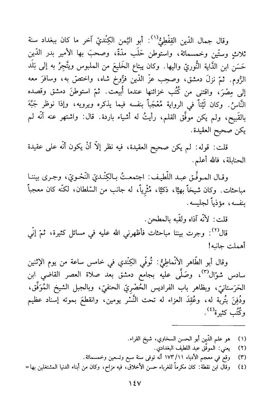 وَقَالَ جمال الدّين القِفْطيّ [1] : أَبُو اليُمن الكِنْدِيّ آخر ما كَانَ ببَغْدَاد سنة ثلاثٍ وستّين وخمسمائة، واستوطن حلب مُدَّة، وصحب بها الْأمير بدر الدّين حسن ابن الدَّاية النُّوري وإليها. وَكَانَ يبتاع الخليع من الملبوس ويتّجرُ بِهِ إلى بلد الرُّوم. ثُمَّ نزل دمشق، وصحب عزّ الدّين فَرُّوخ شاه، واختصّ بِهِ، وسافر معه إلى مِصْر، واقتنى من كتب خزائنها عند ما أُبيعت. ثُمَّ استوطن دمشق وقصده النَّاس. وَكَانَ ليّنا في الرواية مُعجبًا بنفسه فيما يذكره ويرويه، وَإِذَا نوظر جبّهَ بالقبيح، ولم يكن موفّق القلم، رَأَيْت لَهُ أشياء باردة. قَالَ: واشتهر عَنْهُ أَنَّهُ لم يكن صحيح العقيدة.