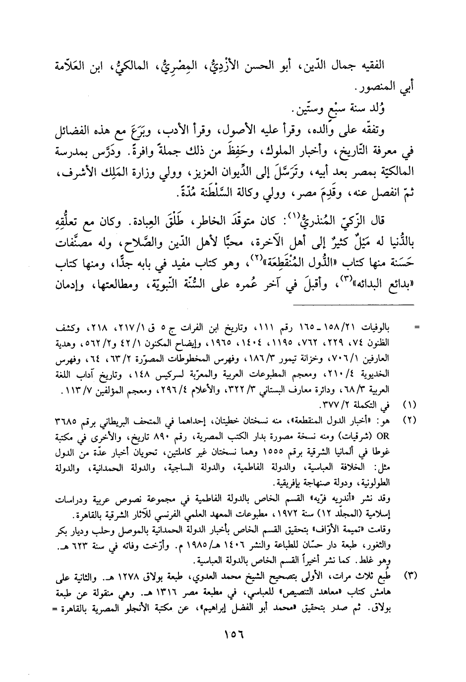 قَالَ الزَّكيّ المُنْذِريّ [1] : كَانَ متوقّد الخاطر، طلق العِبادة. وَكَانَ مَعَ تعلّقهِ بالدّنيا لَهُ ميلٌ كثيرٌ إلى أهل الآخرة، محبّا لأهل الدّين والصّلاح، وَلَهُ مصنّفات حسنة منها كتاب «الدّول المُنقطعة» [2] ، وَهُوَ كتاب مفيد في بابه جدّا، ومنها كتاب «بدائع البدائه» [3] ، وأقبل في آخر عُمره عَلَى السُّنة النّبويّة، ومطالعتها، وإدمان