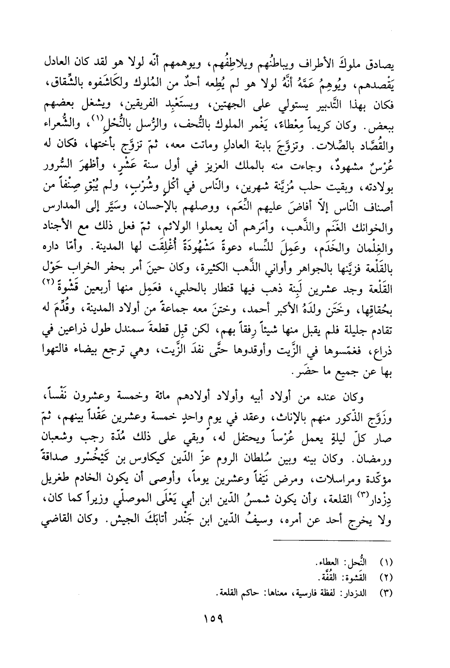 وَكَانَ عنده من أولاد أَبِيهِ وأولاد أولادهم مائة وخمسة وعشرون نفسا، وزوّج الذّكور منهم بالإناث، وعقد في يوم واحدٍ خمسة وعشرين عقدا بينهم، ثُمَّ صار كلّ ليلةٍ يعمل عُرسًا ويحتفل لَهُ، وبقي عَلَى ذَلِكَ مُدَّة رجب وشعبان ورمضان. وَكَانَ بينه وبين سلطان الروم عزّ الدّين كيكاوس بن كَيْخُسْرو صداقة مؤكّدة ومراسلات، ومرض نيّفا وعشرين يوما، وأوصى أن يكون الخادم طغريل دزدار [3] القلعة، وأن يكون شمس الدّين ابن أَبِي يَعْلَى المَوْصِليّ وزيرا كما كَانَ، ولا يخرج أحد عن أمره، وسيف الدّين ابن جندر أتابك الجيش. وكان القاضي