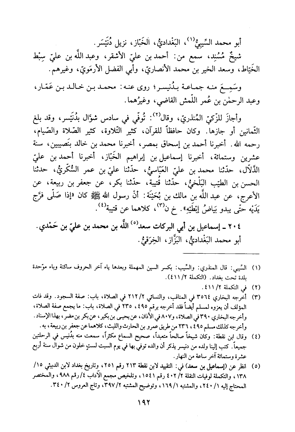 وأجاز للزَّكيّ المُنْذِريّ، وَقَالَ [2] : تُوُفِّي في سادس شوّال بدُنيسر، وقد بلغ الثّمانين أَوْ جازها. وَكَانَ حافظا للقرآن، كثير التّلاوة، كثير الصَّلَاة والصّيام، رحمه اللَّه. أَخْبَرَنَا أَحْمَدُ بْنُ إِسْحَاقَ بِمِصْرَ، أَخْبَرَنَا مُحَمَّدُ بْنُ خَالِدٍ بِنَصِيبِينَ، سَنَةَ عِشْرِينَ وستمائة، أَخْبَرَنَا إِسْمَاعِيلُ بْنُ إِبْرَاهِيمَ الْخَبَّازُ، أَخْبَرَنَا أَحْمَدُ بْنُ عَلِيٍّ الدَّلالُ، حَدَّثَنَا مُحَمَّدُ بْنُ عَلِيٍّ الْعَبَّاسِيُّ، حَدَّثَنَا عَلِيُّ بْنُ عُمَرَ السُّكَّرِيُّ، حَدَّثَنَا الْحَسَنُ بْنُ الطَّيِّبِ الْبَلْخِيُّ، حَدَّثَنَا قُتَيْبَةُ، حَدَّثَنَا بَكْرٌ، عَنْ جَعْفَرِ بْنِ رَبِيعَةَ، عَنِ الْأَعْرَجِ، عَنْ عَبْدِ اللَّهِ بْنِ مَالِكِ بْنِ بُحَيْنَةَ: أَنَّ رَسُولَ اللَّهِ صَلَّى اللَّهُ عَلَيْهِ وَسَلَّمَ كَانَ «إِذَا صَلَّى فَرَّجَ يَدَيْهِ حَتَّى يَبْدُوَ بَيَاضُ إِبِطَيْهِ» . خ ن [3] ، كِلَاهُمَا عَنْ قُتَيْبَةَ [4] . 204- إسْمَاعِيل بن أَبِي البركات سَعْد [5] اللَّه بن مُحَمَّد بن عَليّ بن حَمْدي.