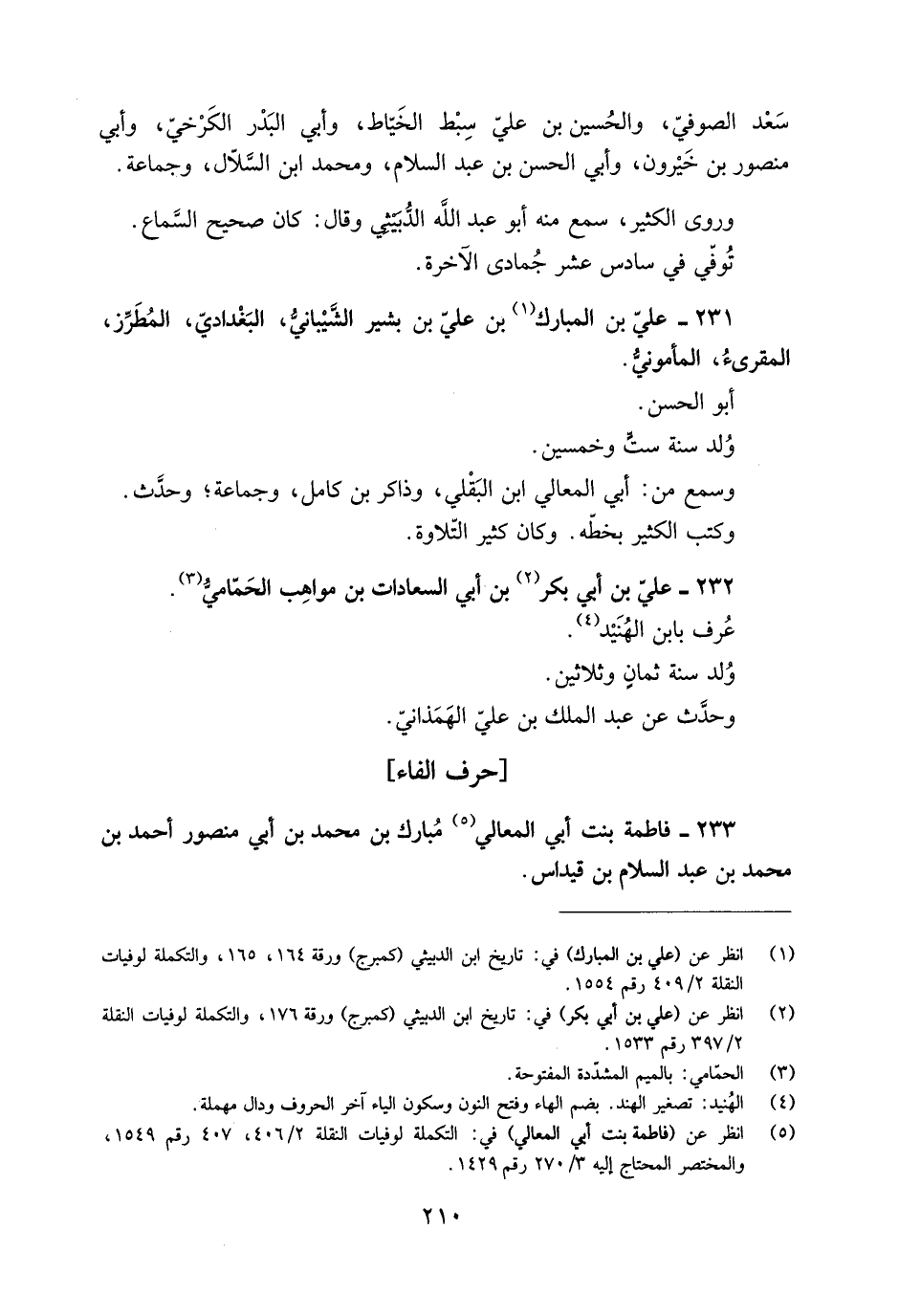 [1] انظر عن (علي بن المبارك) في: تاريخ ابن الدبيثي (كمبرج) ورقة 164، 165، والتكملة لوفيات النقلة 2/ 409 رقم 1554.