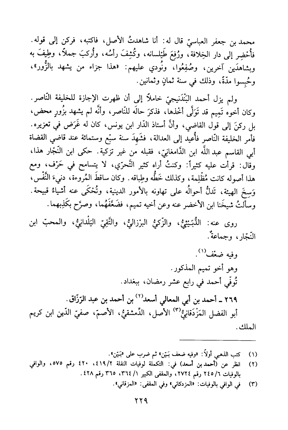 [2] انظر عن (أحمد بن أسعد) في: التكملة لوفيات النقلة 2/ 419، 420 رقم 575، والوافي بالوفيات 6/ 245 رقم 2724، والمقفى الكبير 1/ 364، 365 رقم 428.