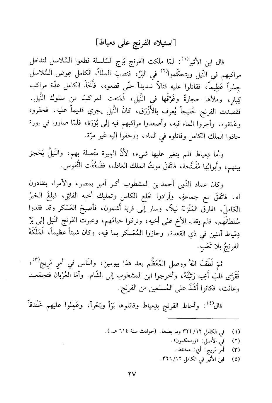 وَكَانَ عماد الدّين أَحْمَد بن المشطوب أكبر أمير بمصر، والْأمراء ينقادون لَهُ، فاتّفق مَعَ جماعةٍ، وأرادوا خلع الكامل وتمليك أخيه الفائز، فبلغَ الخبرُ الكاملَ، ففارق المنْزلة ليلا، وسار إلى قرية أشمون، فأصبحَ العَسْكر وقد فقدوا سُلطانهم، فلم يقف الْأخ عَلَى أخيه، وتركوا خيامَهم، وعبرت الفرنج النّيل إلى بَرِّ دِمِياط آمنين في ذي القِعْدَة، وحازوا المُعَسْكر بما فيه، وَكَانَ شيئا عظيما، فَمَلَكهُ الفرنجُ بلا تَعَبٍ.