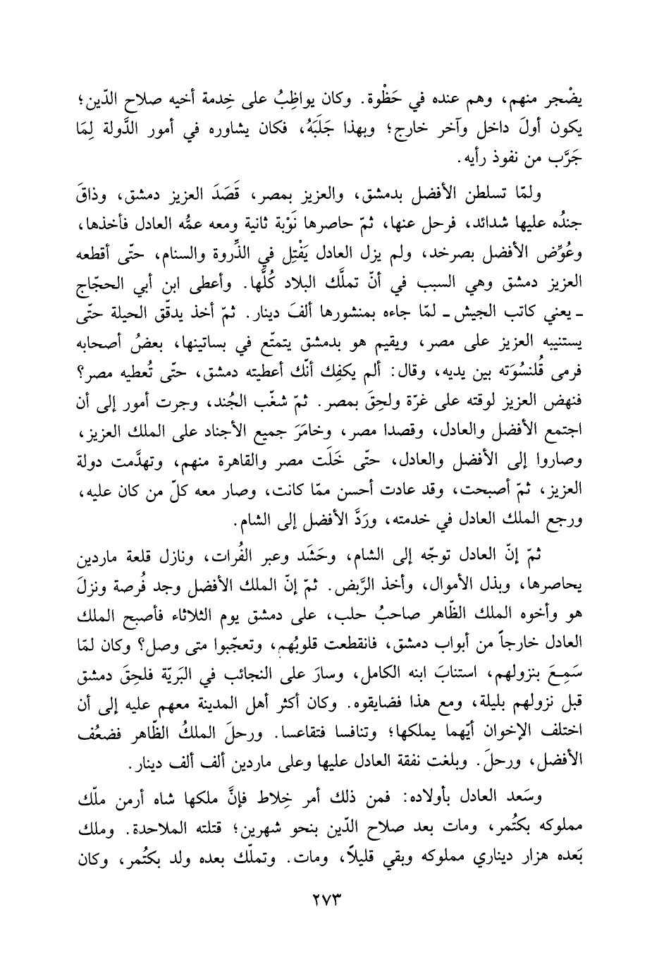 وَلَمَّا تسلطن الْأفضل بدمشق، والعزيز بمصر، قَصَد العزيز دمشق، وذاقَ جندهُ عليها شدائد، فرحل عَنْهَا، ثُمَّ حاصرها نَوْبة ثانية ومعه عمُّه العادل فأخذها، وعُوِّض الْأفضل بصرخد، ولم يزل العادل يَفْتل في الذّروة والسنام، حتّى أقطعه العزيز دمشق وَهِيَ السبب في أنْ تملّك البلاد كُلّهَا. وأعطى ابن أَبِي الحجّاج- يعني كاتب الجيش- لَمَّا جاءه بمنشورها ألف دينار. ثُمَّ أخذ يدقّق الحيلة حَتَّى يستنيبه العزيز عَلَى مِصْر، ويقيم هُوَ بدمشق يتمتّع في بساتينها، بعضُ أصحابه فرمى قُلُنسوته بين يديه، وَقَالَ: ألم يكفِك أنّك أعطيته دمشق، حَتَّى تُعطيه مِصْر؟
