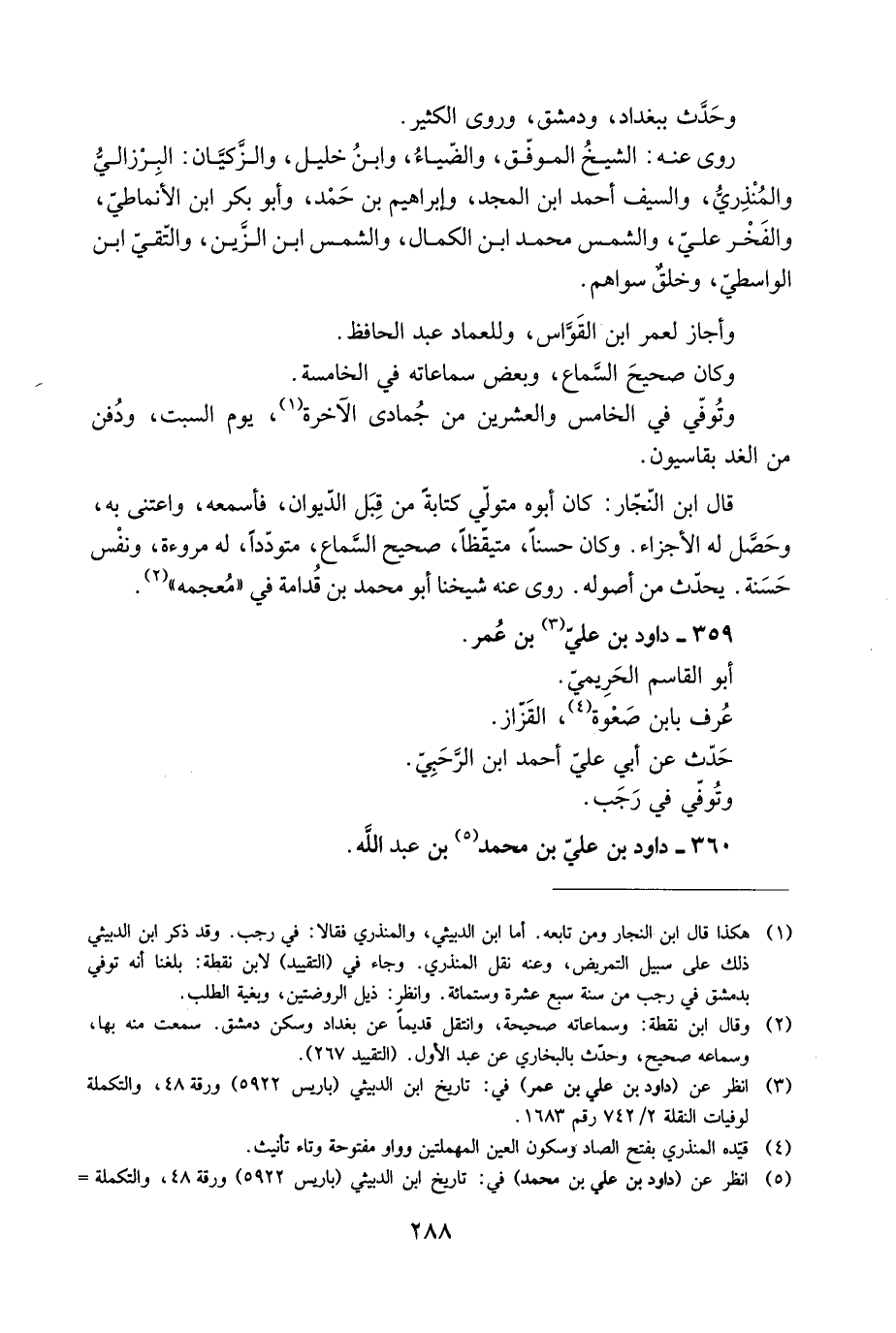 [5] انظر عن (داود بن علي بن محمد) في: تاريخ ابن الدبيثي (باريس 5922) ورقة 48، والتكملة