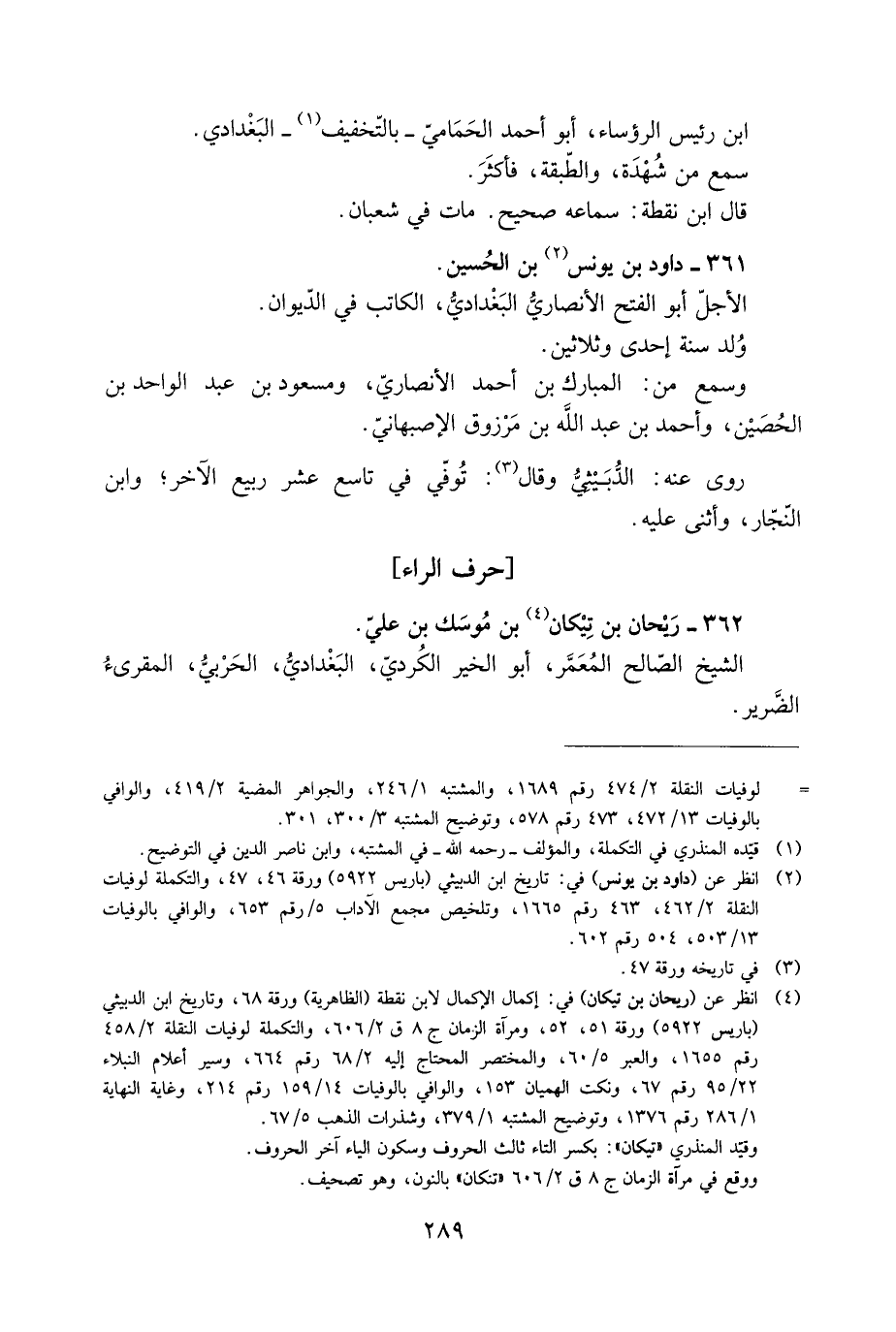 [4] انظر عن (ريحان بن تيكان) في: إكمال الإكمال لابن نقطة (الظاهرية) ورقة 68، وتاريخ ابن الدبيثي (باريس 5922) ورقة 51، 52، ومرآة الزمان ج 8 ق 2/ 606، والتكملة لوفيات النقلة 2/ 458 رقم 1655، والعبر 5/ 60، والمختصر المحتاج إليه 2/ 68 رقم 664، وسير أعلام النبلاء 22/ 95 رقم 67، ونكت الهميان 153، والوافي بالوفيات 14/ 159 رقم 214، وغاية النهاية 1/ 286 رقم 1376، وتوضيح المشتبه 1/ 379، وشذرات الذهب 5/ 67.
