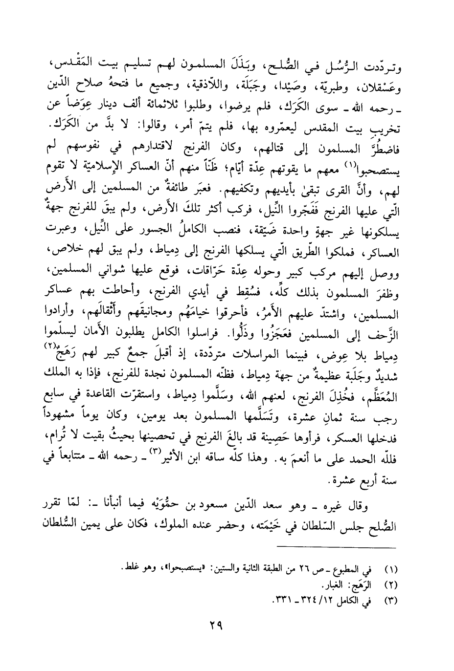 وتردّدت الرُّسُل في الصُّلح، وبَذَلَ المسلمون لهم تسليم بيت المَقْدِس، وعَسْقلان، وطبريَّة، وصَيْدا، وجَبَلَة، واللّاذقية، وجميع ما فتحهُ صلاح الدّين- رحمه الله- سوى الكرك، فلم يرضوا، وطلبوا ثلاثمائة ألف دينار عوضا عن تخريب بين المَقْدِس ليعمّروه بها، فلم يتمّ أمر، وقالوا: لا بدّ من الكَرَك.