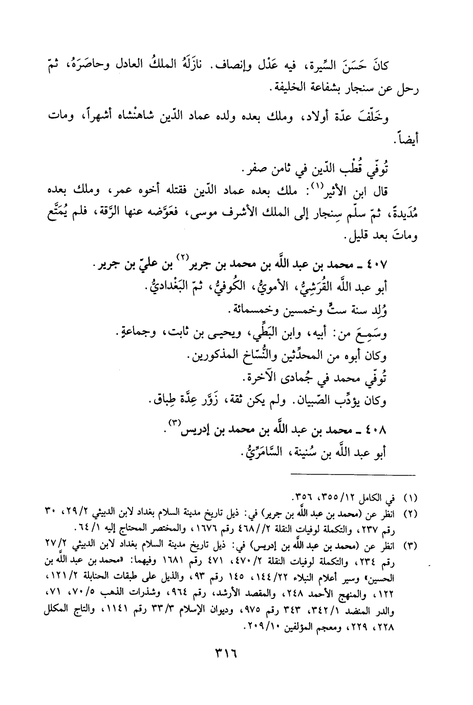 [2] انظر عن (محمد بن عبد الله بن جرير) في: ذيل تاريخ مدينة السلام بغداد لابن الدبيثي 2/ 29، 30 رقم 237، والتكملة لوفيات النقلة 2/ 468 رقم 1676، والمختصر المحتاج إليه 1/ 64.