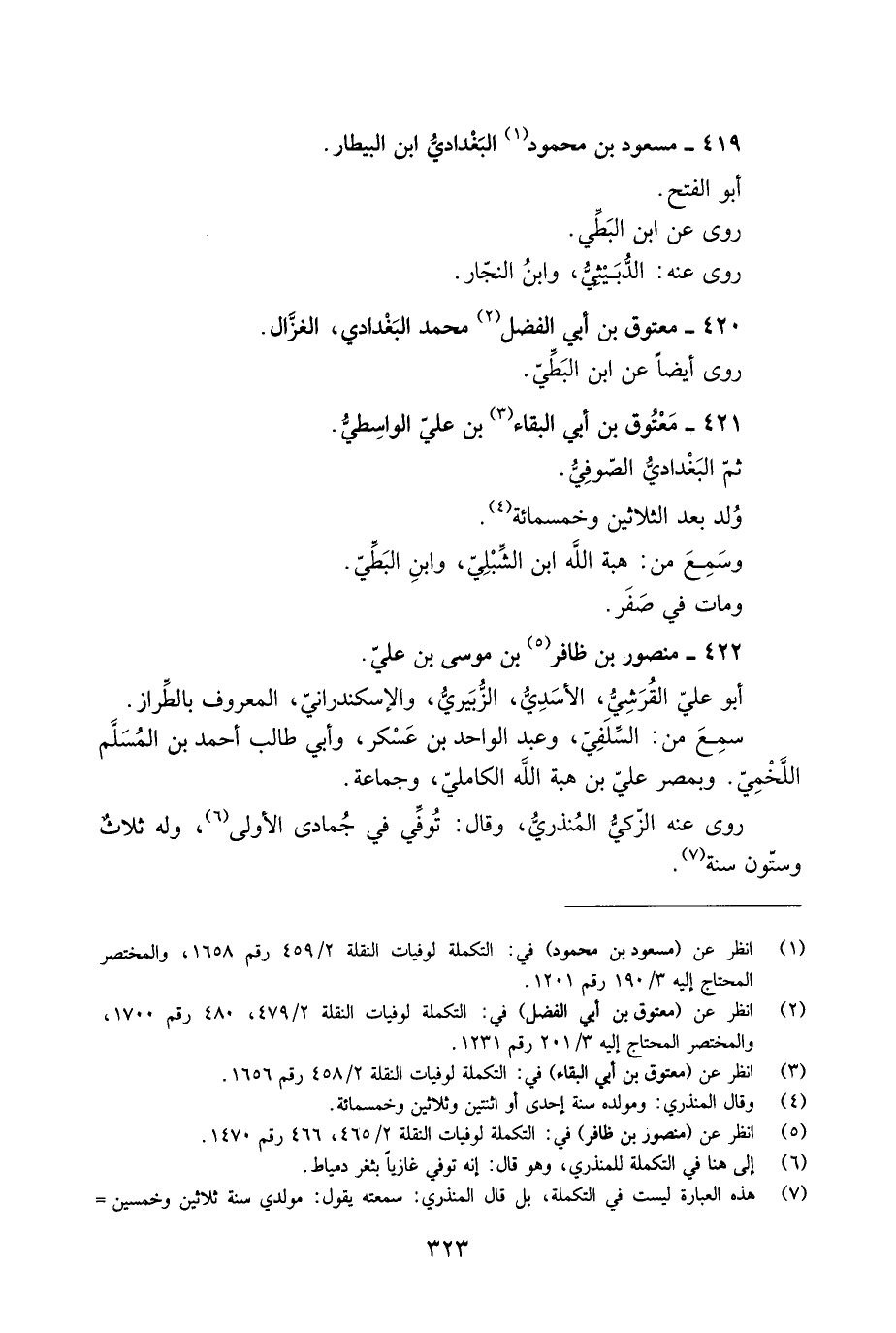 [7] هذه العبارة ليست في التكملة، بل قال المنذري: سمعته يقول: مولدي سنة ثلاثين وخمسين