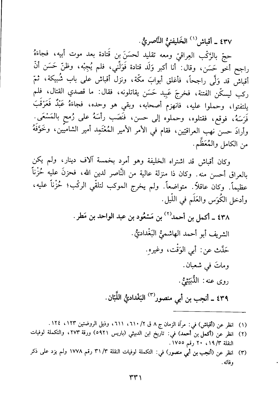 [2] انظر عن (أكمل بن أحمد) في: تاريخ ابن الدبيثي (باريس 5921) ورقة 273، والتكملة لوفيات النقلة 3/ 19، 20 رقم 1755.