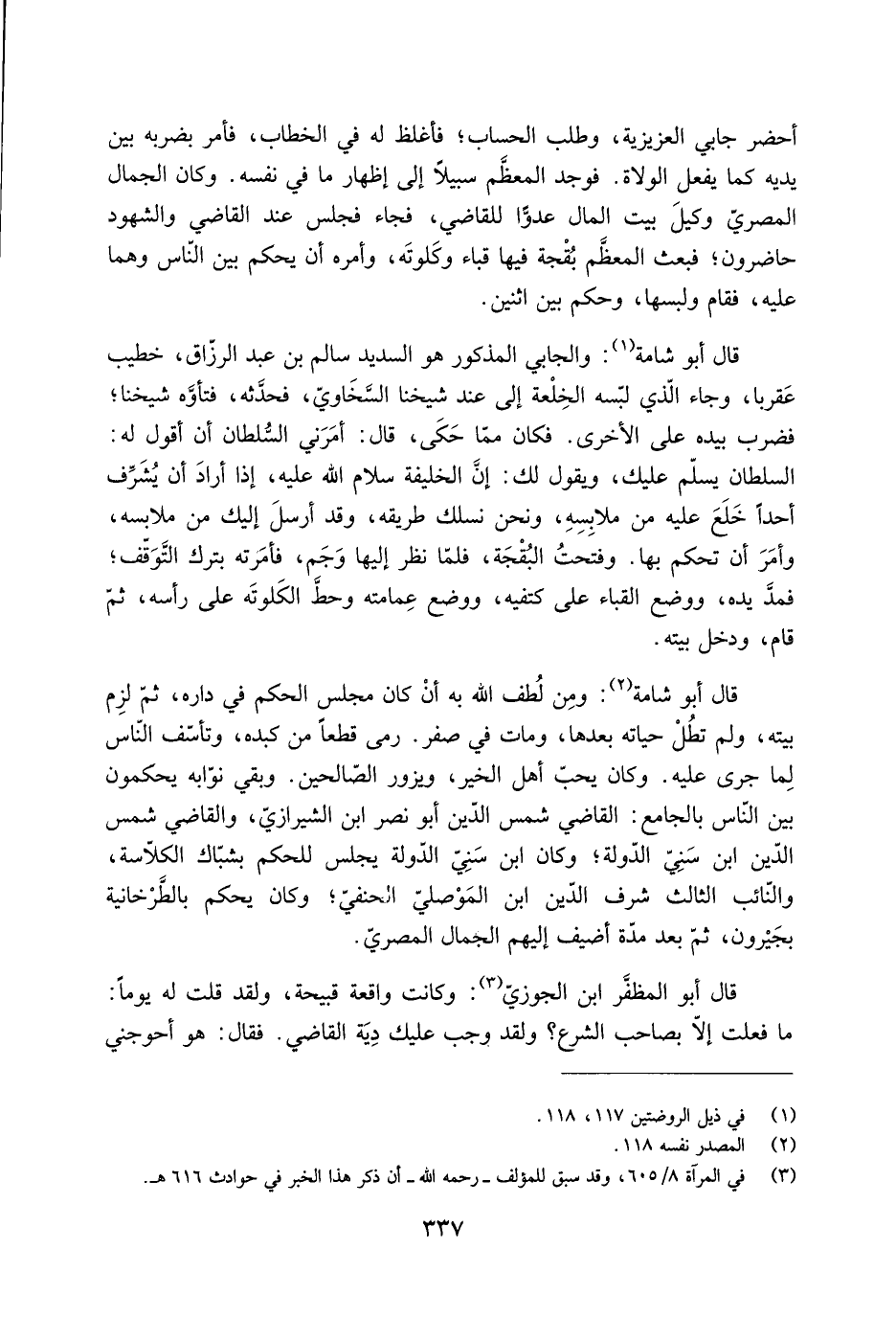 السلطان يسلم عليك، وَيَقُولُ لك: إِنَّ الخليفة سلام اللَّه عليه، إذا أراد أن يشرف أحدا خلع عَلَيْهِ من ملابسِه، وَنَحْنُ نسلك طريقه، وقد أرسل إليك من ملابسه، وأمَرَ أن تحكم بها. وفتحتُ البُقْجَة، فَلَمَّا نظر إليها وَجَم، فأمرته بترك التوقف، فمد يده، ووضع القباء على كتفيه، ووضع عمامته وحط الكلوتة على رأسه، ثُمَّ قام، ودخل بيته.