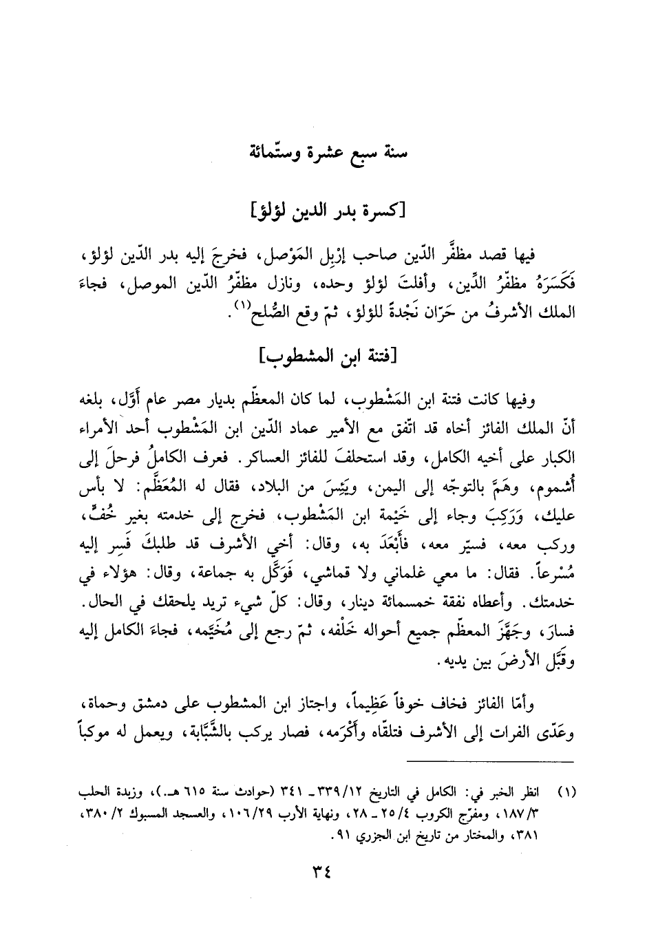 فيها قصد مُظَفَّر الدّين صاحب إربل المَوْصِل، فخرجَ إِلَيْهِ بدر الدّين لؤلؤ، فَكَسَرهُ مُظَفَّر الدّين، وأفلتَ لؤلؤ وحده، ونازل مُظَفَّرُ الدّين المَوْصِل، فجاءَ الملك الْأشرفُ من حرّان نَجْدةً للؤلؤ، ثُمَّ وقع الصُّلح [1] .