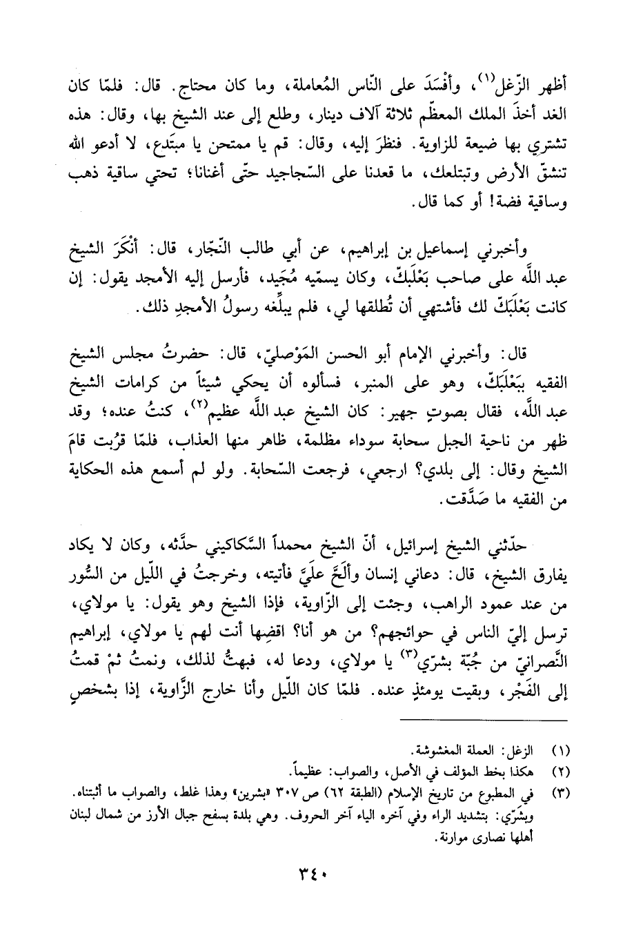 حَدَّثَنِي الشَّيْخ إسرائيل، أَنَّ الشَّيْخ مُحَمَّدًا السَّكاكيني حدّثه، وَكَانَ لَا يكاد يفارق الشَّيْخ، قَالَ: دعاني إِنْسَان وألحّ عَليّ فأتيته، وخرجت في اللّيل من السُّور من عند عمود الراهب، وجئت إلى الزّاوية، فَإِذَا الشَّيْخ وَهُوَ يَقُولُ: يا مولاي، ترسل إليّ النَّاس في حوائجهم؟ من هُوَ أَنَا؟ اقضها أَنْتَ لهم يا مولاي، إِبْرَاهِيم النَّصْرَانيّ من جُبَّة بشري [3] يا مولاي، ودعا لَهُ، فبهتّ لِذَلِكَ، ونمتُ ثُمَّ قمتُ إلى الفَجْر، وبقيت يومئذ عنده. فَلَمَّا كَانَ اللّيل وَأَنَا خارج الزَّاوية، إذا بشخص