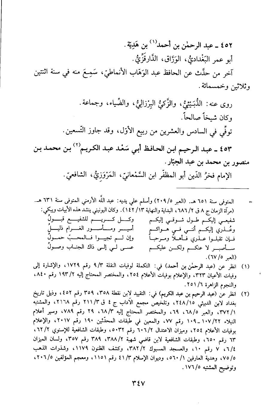 [2] انظر عن (عبد الرحيم بن عبد الكريم) في: التقييد لابن نقطة 358، 359 رقم 452، وذيل تاريخ بغداد لابن الدبيثي 15/ 248، وتلخيص مجمع الآداب ج 4 ق 3/ 211 رقم 2168، والمشتبه 1/ 372، والعبر 5/ 68، 69، والمختصر المحتاج إليه 3/ 68، 29 رقم 789، وسير أعلام النبلاء 22/ 107- 109 رقم 77، والمعين في طبقات المحدّثين 190 رقم 2017، والإعلام بوفيات الأعلام 254، وميزان الاعتدال 2/ 606 رقم 5032، وطبقات الشافعية للإسنويّ 2/ 62، 63 رقم 650، وطبقات الشافعية لابن قاضي شهبة 2/ 388، 389 رقم 357، ولسان الميزان 4/ 6، 7 رقم 10، والعسجد المسبوك 2/ 382، وكشف الظنون 1179، وشذرات الذهب 5/ 75، وهدية العارفين 1/ 560، وديوان الإسلام 3/ 41 رقم 1151، ومعجم المؤلفين 5/ 206، وتوضيح المشتبه 5/ 176.
