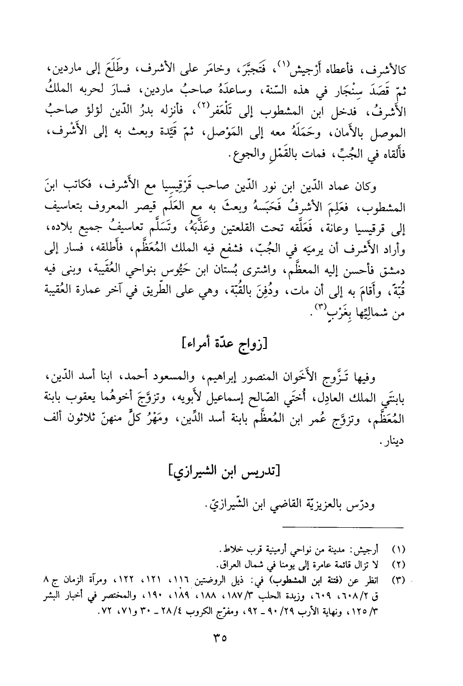كالأشرف، فأعطاه أرجيش [1] ، فتجبّر، وخامَر عَلَى الْأشرف، وطَلَعَ إلى ماردين، ثُمَّ قَصد سِنْجار في هذه السّنة، وساعدَه صاحبُ ماردين، فسارَ لحربه الملكُ الْأشرفُ، فدخل ابن المشطوب إلى تلْعَفر [2] ، فأنزله بدرُ الدّين لؤلؤ صاحب الموصل بالأمان، وحمله معه إلى الموصل، ثمّ قيّدة وبعث بِهِ إلى الأشرف، فألقاه في الجبّ، فمات بالقَمْل والجوع.