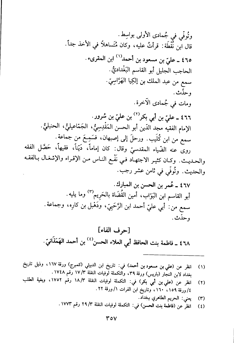 [1] انظر عن (علي بن مسعود بن أحمد) في: تاريخ ابن الدبيثي (كمبرج) ورقة 167، وذيل تاريخ بغداد لابن النجار (باريس) ورقة 39، والتكملة لوفيات النقلة 3/ 17 رقم 1748.