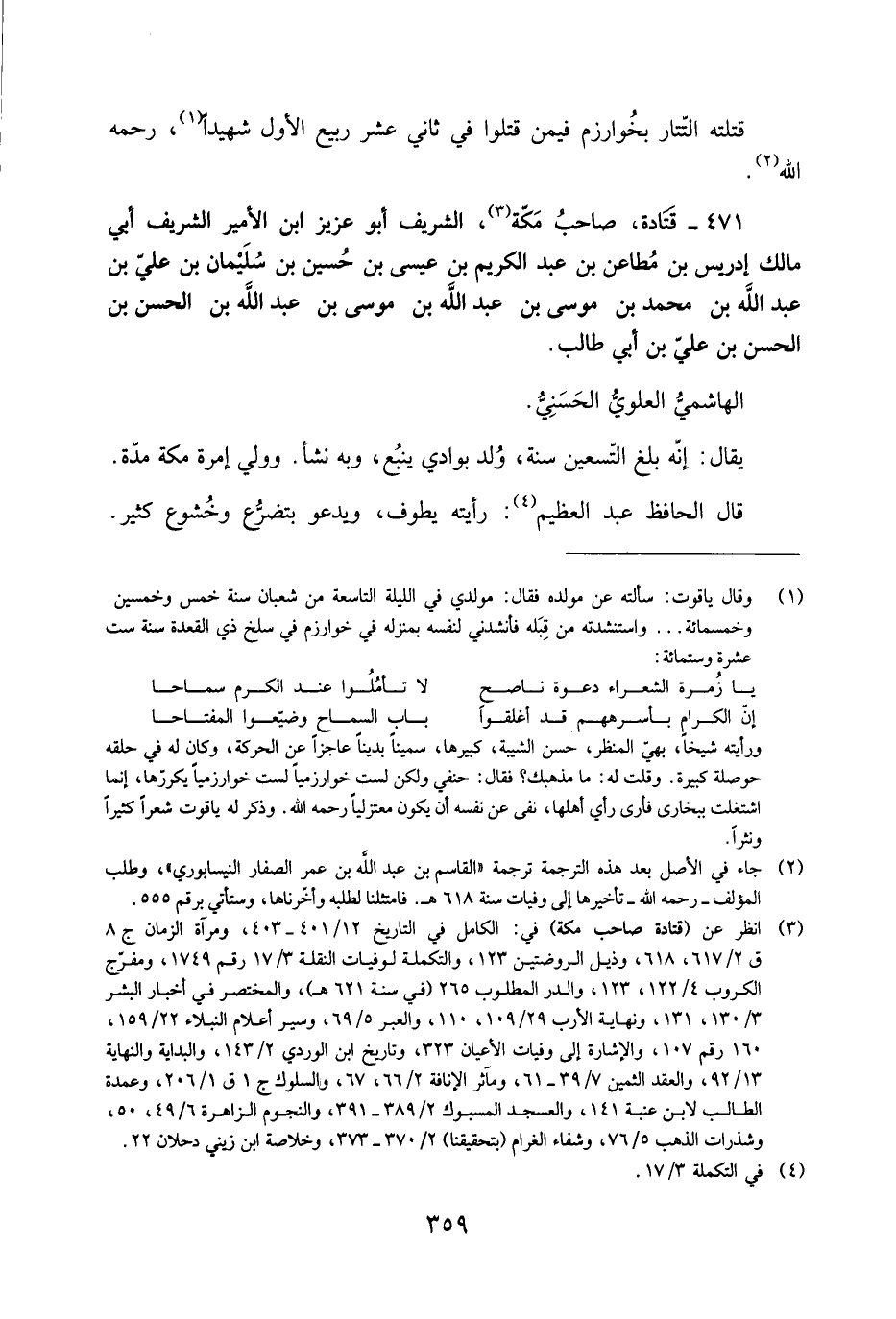 471- قتادة، صاحب مَكَّة [3] ، الشريف أَبُو عزيز ابن الْأمير الشريف أَبِي مالك إدريس بن مُطاعن بن عَبْد الكريم بن عيسى بن حُسين بْنُ سُلَيْمَانُ بْنُ عَلِيِّ بْنِ عَبْدِ اللَّهِ بْنِ مُحَمَّدً بْن مُوسَى بْن عَبْد اللَّه بْن مُوسَى بْنِ عَبْد اللَّه بْنُ الْحَسَنِ بْنِ الْحَسَنِ بْنِ عَلِيِّ بْنِ أَبِي طَالِب.