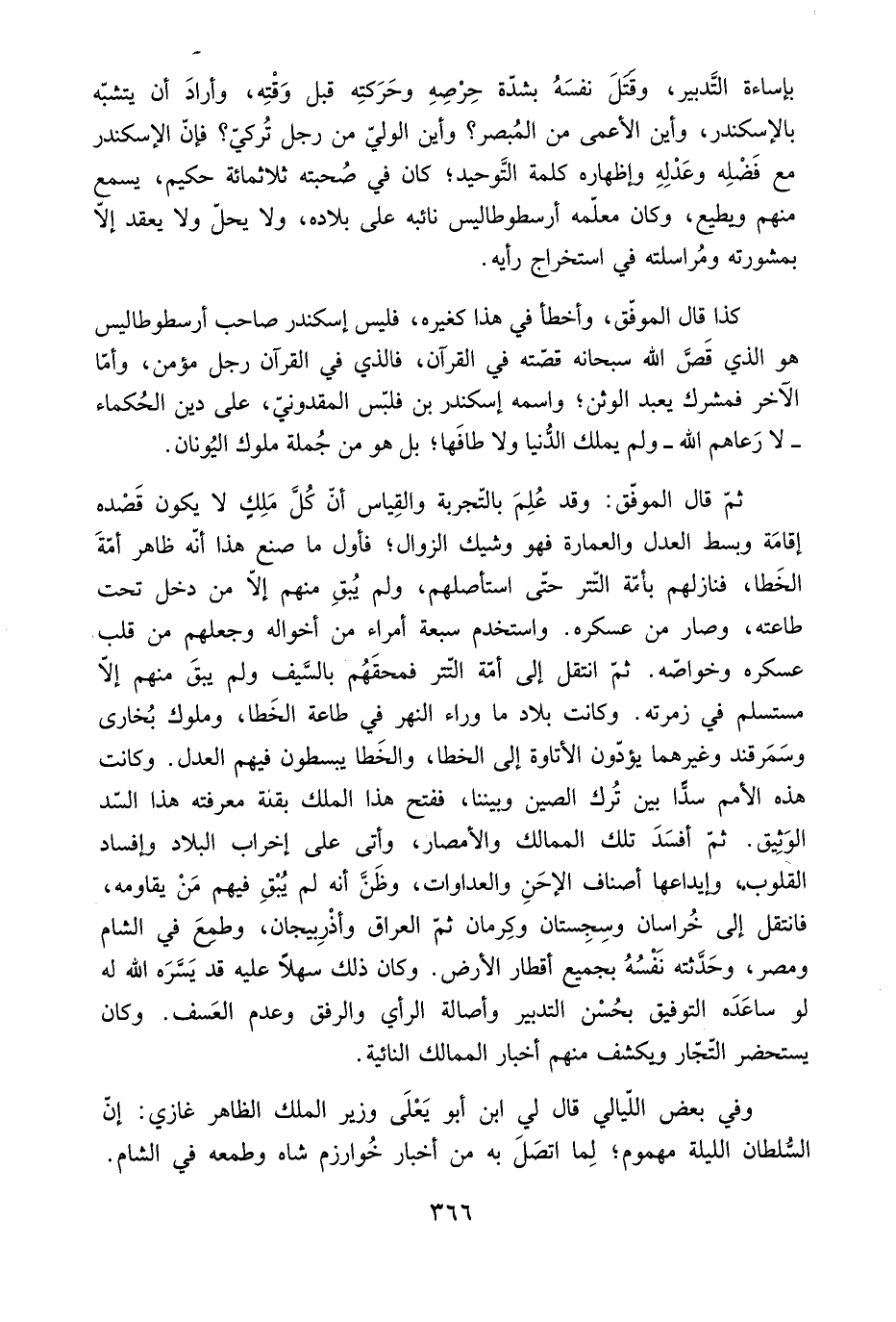 بإساءة التّدبير، وقَتَل نفسه بشدَّة حرصه وحركته قبل وقته، وأراد أن يتشبّه بالإسكندر، وأين الْأعمى من المُبصر؟ وأين الوليّ من رجل تركيّ؟ فإنّ الإسكندر مع فضله وعدله وإظهاره كلمة التّوحيد، كان في صحبته ثلاثمائة حكيم، يسمع منهم ويطيع، وكان معلّمه أرسطوطاليس نائبة عَلَى بلاده، ولا يحلّ ولا يعقد إِلَّا بمشورته ومُراسلته في استخراج رأيه.