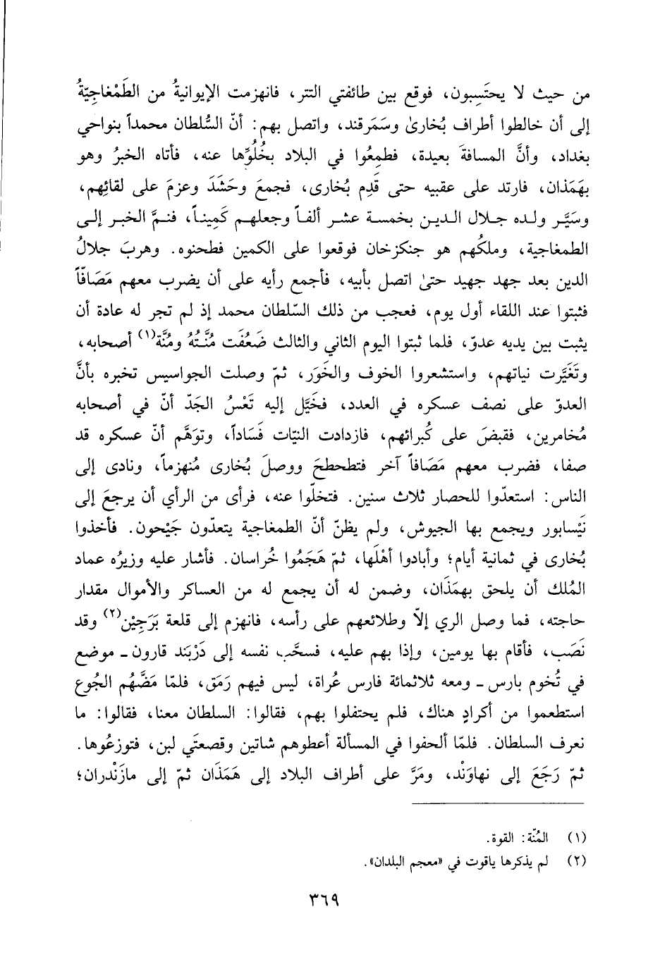 من حيث لَا يحتسبون، فوقع بين طائفتي التَّتَر، فانهزمت الإيوانية من الطَمْغاجية إلى أن خالطوا أطراف بُخَارَى وَسَمَرْقَنْد، واتصل بهم: أَنَّ السُّلْطَان مُحَمَّدًا بنواحي بَغْدَاد، وأنّ المسافة بعيدة، فطمعوا في البلاد بخُلُوّها عَنْهُ، فأتاه الخبر وَهُوَ بهمذان، فارتد عَلَى عقبيه حَتَّى قَدِمَ بُخَارَى، فجمع وحَشَد وعزمَ عَلَى لقائهم، وسيَّر ولده جلال الدِّين بخمسة عشر ألفا وجعلهم كَمينًا، فنمّ الخبر إلى الطمغاجية، وملكُهم هُوَ جنكزخان فوقعوا عَلَى الكمين فطحنوه. وهربَ جلالُ الدِّين بعد جهد جهيد حَتَّى اتصل بأبيه، فأجمع رأيه عَلَى أن يضرب معهم مصافّا فثبتوا عند اللقاء أَوَّل يوم، فعجب من ذَلِكَ السُّلْطَان مُحَمَّد إِذْ لم تجر لَهُ عادة أن يثبت بين يديه عدوّ، فَلَمَّا ثبتوا اليوم الثاني والثالث ضعُفت مُنَّتُه ومُنَّة [1] أصحابه، وتغيّرت نياتهم، واستشعروا الخوف والخور، ثُمَّ وصلت الجواسيس تخبره بأنّ العدوّ عَلَى نصف عسكره في العدد، فخيّل إِلَيْهِ تعسُ الجدّ أنّ في أصحابه مُخامرين، فقبض عَلَى كُبرائهم، فازدادت النيّات فسادا، وتوهّم أنّ عسكره قد صفا، فضرب معهم مصافا آخر فتطحطح ووصل بُخَارَى مُنهزمًا، ونادى إلى النَّاس: استعدّوا للحصار ثلاث سنين. فتخلّوا عَنْهُ، فرأى من الرأي أن يرجع إلى نَيْسَابُور ويجمع بها الجيوش، ولم يظنّ أنّ الطمغاجية يتعدّون جيحون. فأخذوا بُخَارَى في ثمانية أيام، وأبادوا أهلها، ثمّ هجموا خُرَاسَان. فأشار عَلَيْهِ وزيره عماد المُلك أن يلحق بهمذان، وضمن لَهُ أن يجمع لَهُ من العساكر والْأموال مقدار حاجته، فما وصل الري إِلَّا وطلائعهم عَلَى رأسه، فانهزم إلى قلعة بَرَجين [2] وقد نَصَب، فأقام بها يومين، وَإِذَا بهم عَلَيْهِ، فسحّب نفسه إلى دربند قارون- موضع في تخوم بارس- ومعه ثلاثمائة فارس عُراة، لَيْسَ فيهم رمق، فَلَمَّا مضَّهُم الجوع استطعموا من أكرادٍ هناك، فلم يحتفلوا بهم، فقالوا: السُّلْطَان معنا، فقالوا: ما نعرف السُّلْطَان. فَلَمَّا ألحفوا في المسألة أعطوهم شاتين وقصعتي لبن، فتوزعُوها.