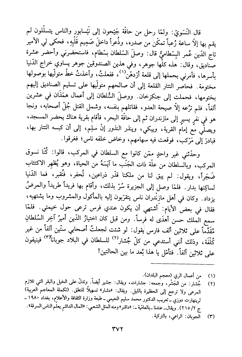 وَحَدَّثَنِي غير واحد ممّن كانوا مَعَ السُّلْطَان في المركب، قَالُوا: كُنّا نسوق المركب، وبالسلطان من علَّة ذات الجنب ما آيسة من الحياة، وَهُوَ يُظهر الاكتئاب ضجرا، ويقول: لم يبق لنا من ملكنا قدْر ذراعين، تُحفر، فنُقبر، فما الدُّنْيَا لساكنها بدار. فَلَمَّا وصل إلى الجزيرة سُرّ بذلك، وأقام بها فريدا طريدا والمرضُ يزداد. وَكَانَ في أهل مازندران ناس يتقرّبون إِلَيْهِ بالمأكول والمشروب وما يشتهيه، فَقَالَ في بعض الْأيام: أشتهي أن يكون عندي فرس ترعى حول خيمتي. فَلَمَّا سَمِعَ الملك حسن أهدَى لَهُ فرسًا. ومن قبل كَانَ اختيار الدِّين أميرُ آخر السُّلْطَان مُقدَّمًا عَلَى ثلاثين ألف فارس يَقُولُ: لو شئت لجعلتُ أصحابي ستّين ألفا من غير كُلفة، وَذَلِكَ أنني أستدعي من كلّ جشار [2] للسلطان في البلاد جوبانا [3] فينيفون عَلَى ثلاثين ألفا. فتأمّل يا هَذَا بُعد ما بين الحالتين!