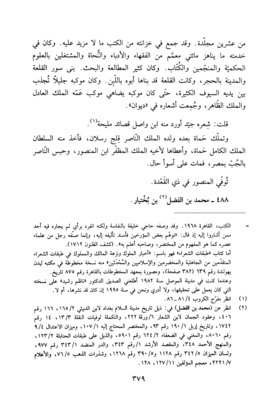 [ () ] الكتب، القاهرة 1968. وقد وصفه حاجي خليفة بالنفاسة ولكنه انفرد برأي لم يجاره فيه أحد ممن أشاروا إليه إذ قال: «توهّم بعض المؤرخين فأسند تأليفه إليه، وإنما صنّفه رجل من علماء عصره كما هو المفهوم من المختصر، وصاحبه أعلم به» . (كشف الظنون 1712) .