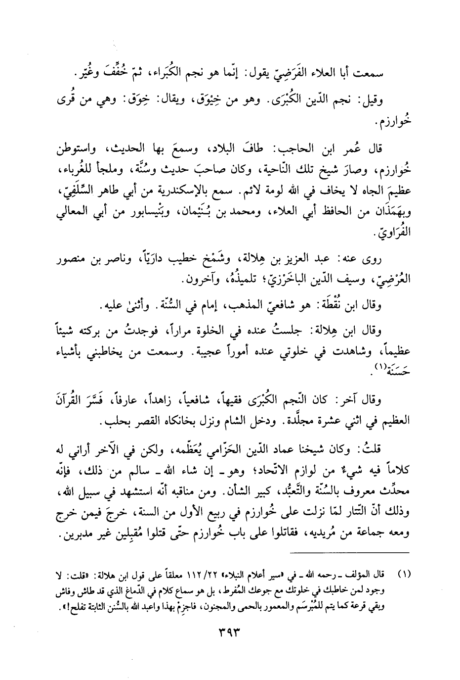 قُلْتُ: وَكَانَ شيخنا عماد الدِّين الحَزّامي يُعَظّمه، ولكن في الآخر أراني لَهُ كلاما فيه شيءٌ من لوازم الاتّحاد، وَهُوَ- إن شاء اللَّه- سالم من ذَلِكَ، فَإِنَّهُ محدِّث معروف بالسُّنَّة والتَّعبُّد، كبير الشأن. ومن مناقبه أَنَّهُ استشهد في سبيل اللَّه، وَذَلِكَ أَنَّ التَّتَار لَمَّا نزلت عَلَى خُوَارِزْم في ربيع الْأَوَّل من السنة، خرجَ فيمن خرج ومعه جماعة من مُريديه، فقاتلوا عَلَى باب خُوَارِزْم حتّى قتلوا مقبلين غير مدبرين.