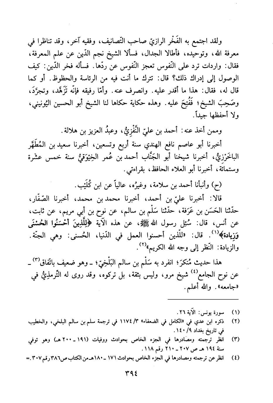 [2] ذكره ابن عدي في «الكامل في الضعفاء» 3/ 1174 في ترجمة سلم بن سالم البلخي، والخطيب في تاريخ بغداد 9/ 140.