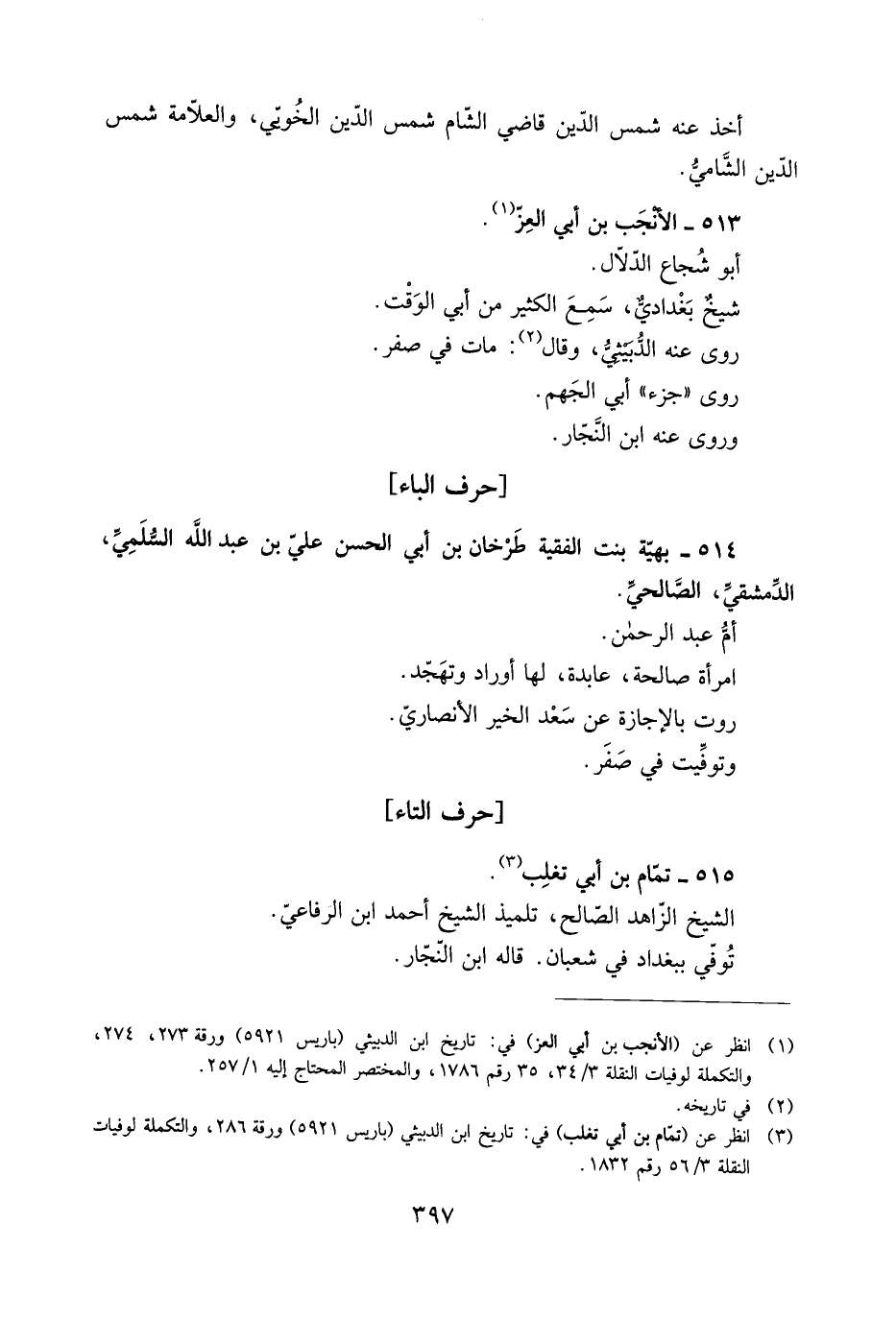 [3] انظر عن (تمّام بن أبي تغلب) في: تاريخ ابن الدبيثي (باريس 5921) ورقة 286، والتكملة لوفيات النقلة 3/ 56 رقم 1832.