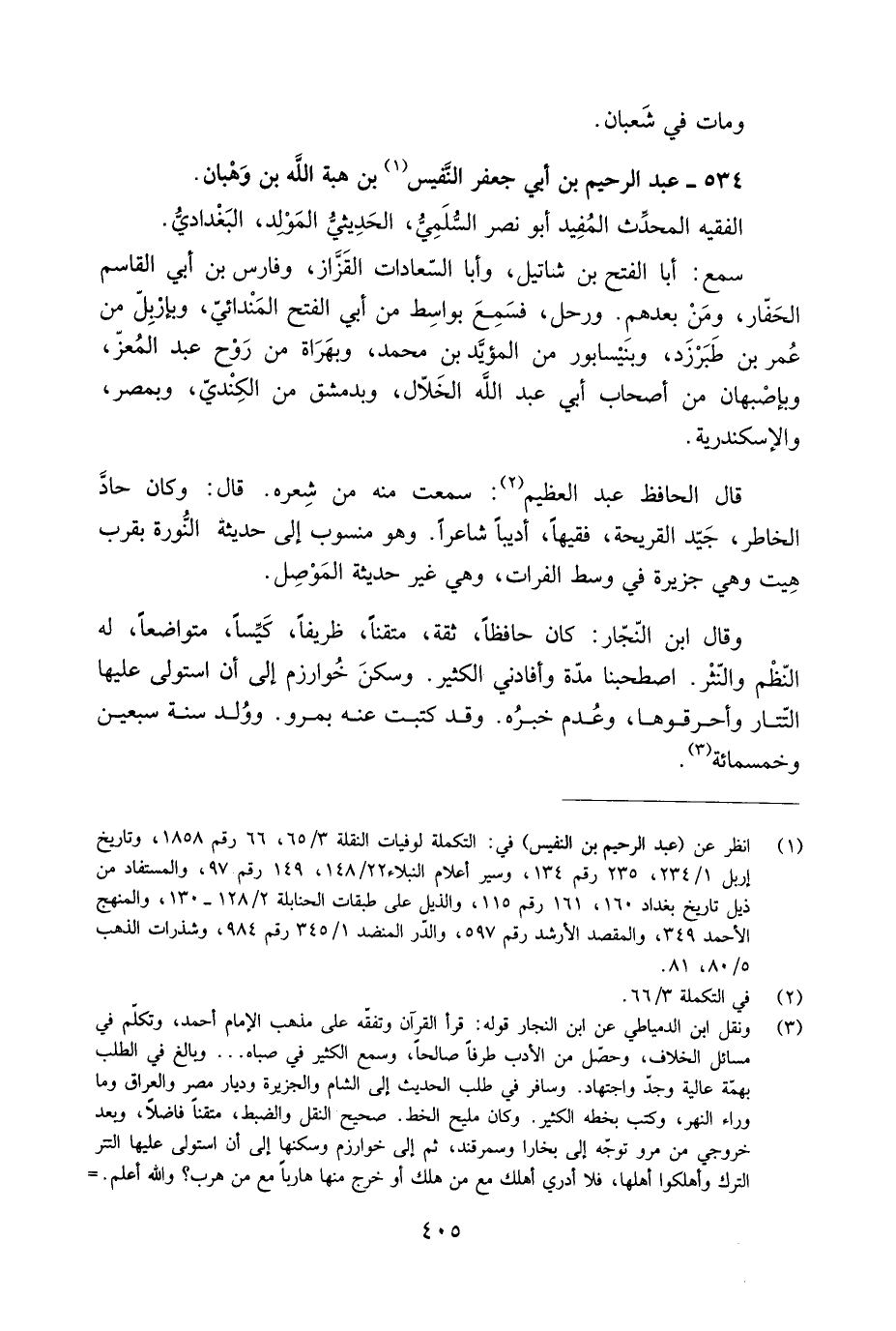 [1] انظر عن (عبد الرحيم بن النفيس) في: التكملة لوفيات النقلة 3/ 65، 66 رقم 1858، وتاريخ إربل 1/ 234، 235 رقم 134، وسير أعلام النبلاء 22/ 148، 149 رقم 97، والمستفاد من ذيل تاريخ بغداد 160، 161 رقم 115، والذيل على طبقات الحنابلة 2/ 128- 130، والمنهج الأحمد 349، والمقصد الأرشد رقم 597، والدرّ المنضد 1/ 345 رقم 984، وشذرات الذهب 5/ 80، 81.