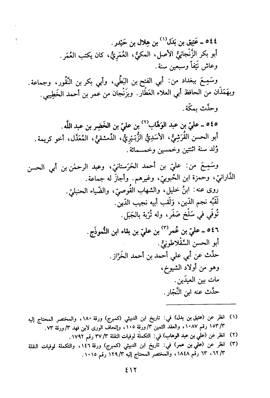 [1] انظر عن (عتيق بن بدل) في: تاريخ ابن الدبيثي (كمبرج) ورقة 180، والمختصر المحتاج إليه 3/ 153 رقم 1087، والعقد الثمين 3/ ورقة 105، وإتحاف الورى لابن فهد 3/ ورقة 73.