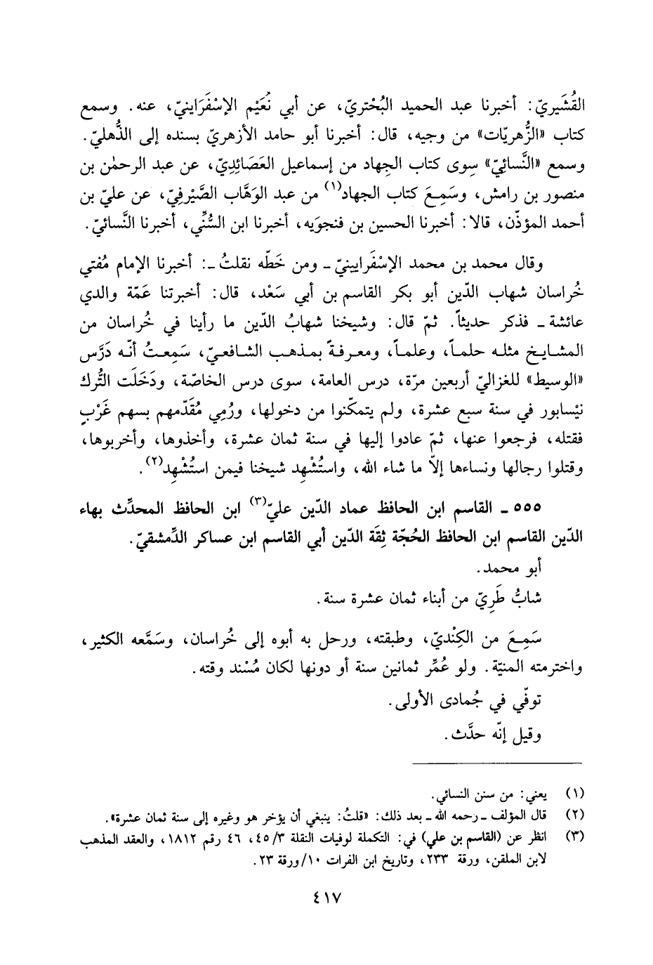 [3] انظر عن (القاسم بن علي) في: التكملة لوفيات النقلة 3/ 45، 46 رقم 1812، والعقد المذهب لابن الملقن، ورقة 233، وتاريخ ابن الفرات 10/ ورقة 23.