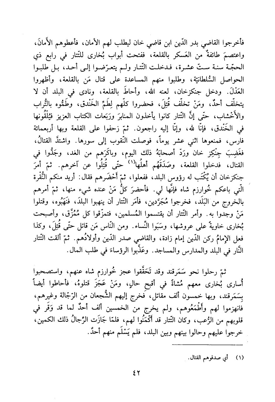 فأخرجوا القاضي بدر الدّين ابن قاضي خان ليطلب لهم الْأمان، فأعطوهم الْأمان، واعتصم طائفةٌ من العسكر بالقلعة، ففتحت أبواب بُخَارَى للتّتار في رابع ذي الحجَّة سنة ستّ عشرة، فدخلت التَّتَار ولم يتعرّضوا إلى أحد، بل طلبوا الحواصل السّلطانيّة، وطلبوا منهم المساعدة عَلَى قتال من بالقلعة، وأظهروا العدل. ودخل جنكزخان، لعنه اللَّه، وأحاط بالقلعة، ونادى في البلد أن لَا يتخلّف أحد، ومن تخلّف قُتل، فحضروا كلّهم لِطَمِّ الخندق، وطَمُّوه بالتّراب والْأخشاب، حَتَّى إِنَّ التَّتَار كانوا يأخذون المنابر وربعات الكتاب العزيز فيُلْقُونها في الخندق، فإنّا للَّه، وَإنَّا إِلَيْهِ راجعون. ثُمَّ زحفوا عَلَى القلعة وبها أربعمائة فارس، فمنعوها اثني عشر يوما، فوصلت النّقوب إلى سورها. واشتدّ القتال، فغضب جنكزخان وردّ أصحابه ذَلِكَ اليوم، وباكرهم من الغد، وجدُّوا في القِتَال، فدخلوا القلعة، وصدَقَهُم أهلها [1] حتّى قتلوا عن آخرهم. ثمّ أمر جنكزخان أن يُكتب لَهُ رءوس البلد، ففعلوا، ثُمَّ أحضرهم فَقَالَ: أريد منكم النُّقْرة الّتي باعكم خُوَارِزْم شاه فإنّها لي. فأحضر كلُّ من عنده شيء منها، ثُمَّ أمرهم بالخروج من البلد، فخرجوا مُجَرَّدين، فأمر التَّتَار أن ينهبوا البلد، فنهبوه، وقتلوا مَنْ وجدوا بِهِ. وأمر التّتار أن يقتسموا المُسلمين، فتمزّقوا كل مُمُزَّق، وأصبحت بُخَارَى خاوية عَلَى عروشها، وسبوا النِّساء. ومن النَّاس من قاتل حَتَّى قُتل، وكذا فعل الإمامُ ركن الدّين إمام زاده، والقاضي صدر الدّين وأولادهم. ثُمَّ ألقت التَّتَار النّار في البلد والمدارس والمساجد. وعذَّبوا الرؤساء في طلب المال.