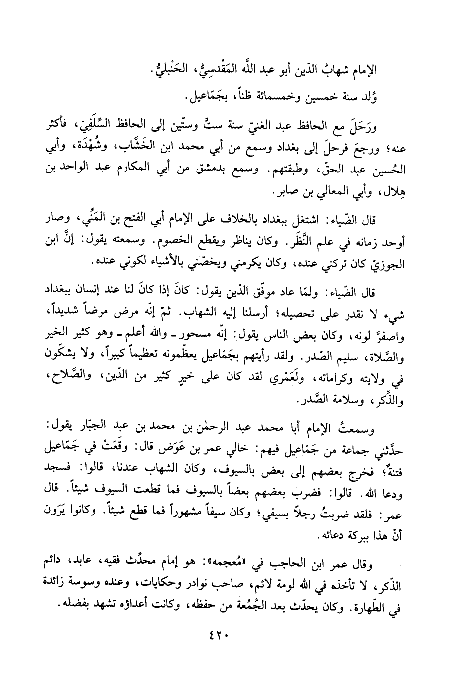 قَالَ الضِّيَاء: وَلَمَّا عاد مُوَفَّق الدِّين يَقُولُ: كَانَ إذا كَانَ لنا عند إِنْسَان ببَغْدَاد شيء لَا نقدر عَلَى تحصيله، أرسلنا إليه الشِّهَاب. ثُمَّ إِنَّهُ مرض مرضا شديدا، واصفرّ لونه، وكان بعض النَّاس يَقُولُ: إِنَّهُ مسحور- واللَّه أعلم- وَهُوَ كثير الخير والصّلاة، سليم الصّدر. ولقد رأيتهم بجَمّاعيل يعظّمونه تعظيما كبيرا، ولا يشكّون في ولايته، وكراماته، ولَعَمْري لقد كَانَ عَلَى خيرٍ كثير من الدِّين، والصّلاح، والذّكر، وسلامة الصّدر.