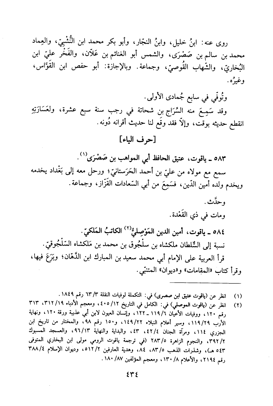 [1] انظر عن (ياقوت عتيق ابن صصريّ) في: التكملة لوفيات النقلة 3/ 63 رقم 1849.