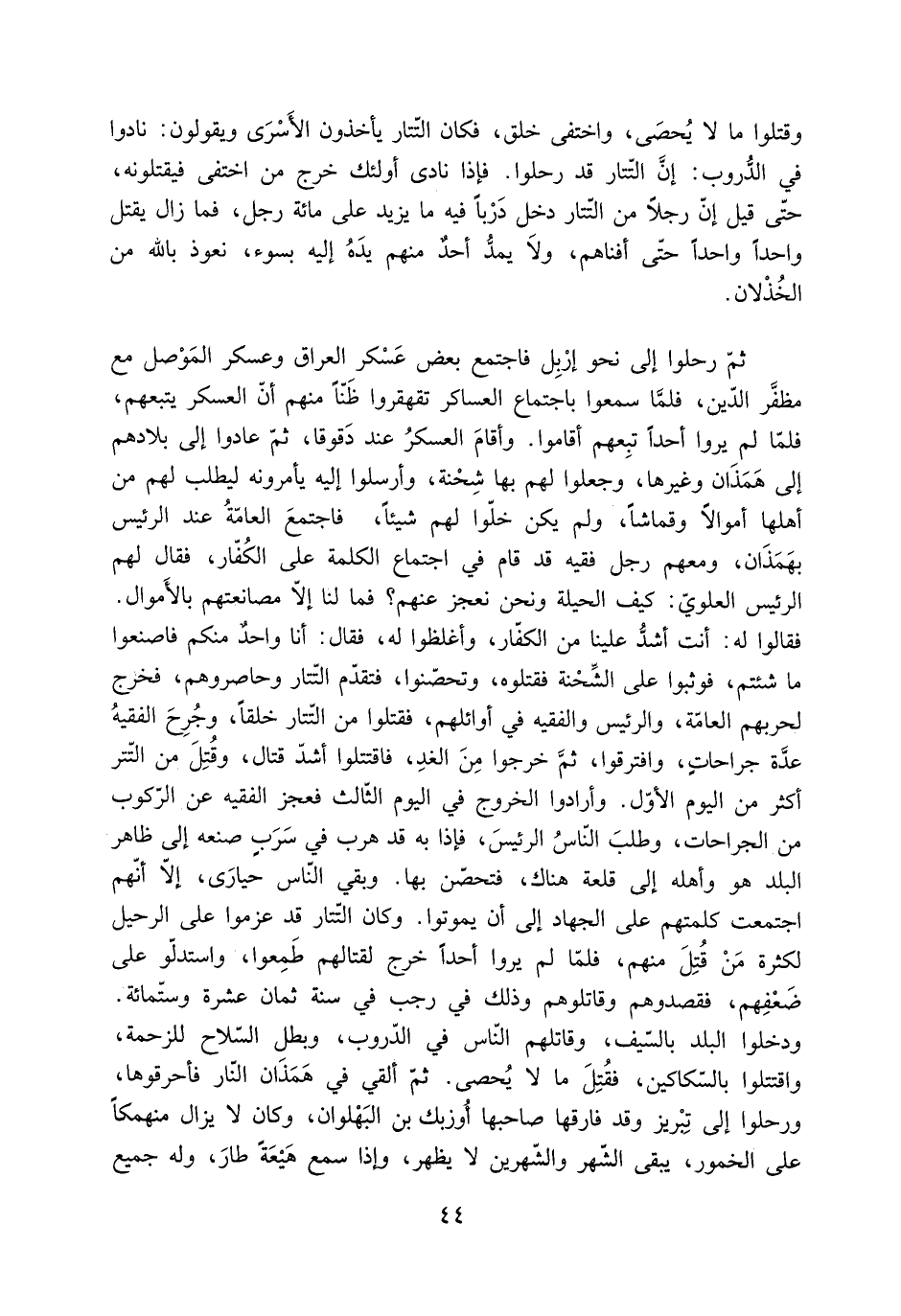ودخلوا البلد بالسّيف، وقاتلهم النَّاس في الدّروب، وبطل السّلاح للزحمة، واقتتلوا بالسّكاكين، فقُتل ما لَا يُحصى. ثُمَّ ألقي في همذان النّار فأحرقوها، ورحلوا إلى تِبْريز وقد فارقها صاحبها أُوزبك بن البَهْلوان، وَكَانَ لَا يزال منهمكا عَلَى الخمور، يبقى الشّهر والشّهرين لَا يظهر، وإذا سَمِعَ هَيْعَةً طارَ، وَلَهُ جميع