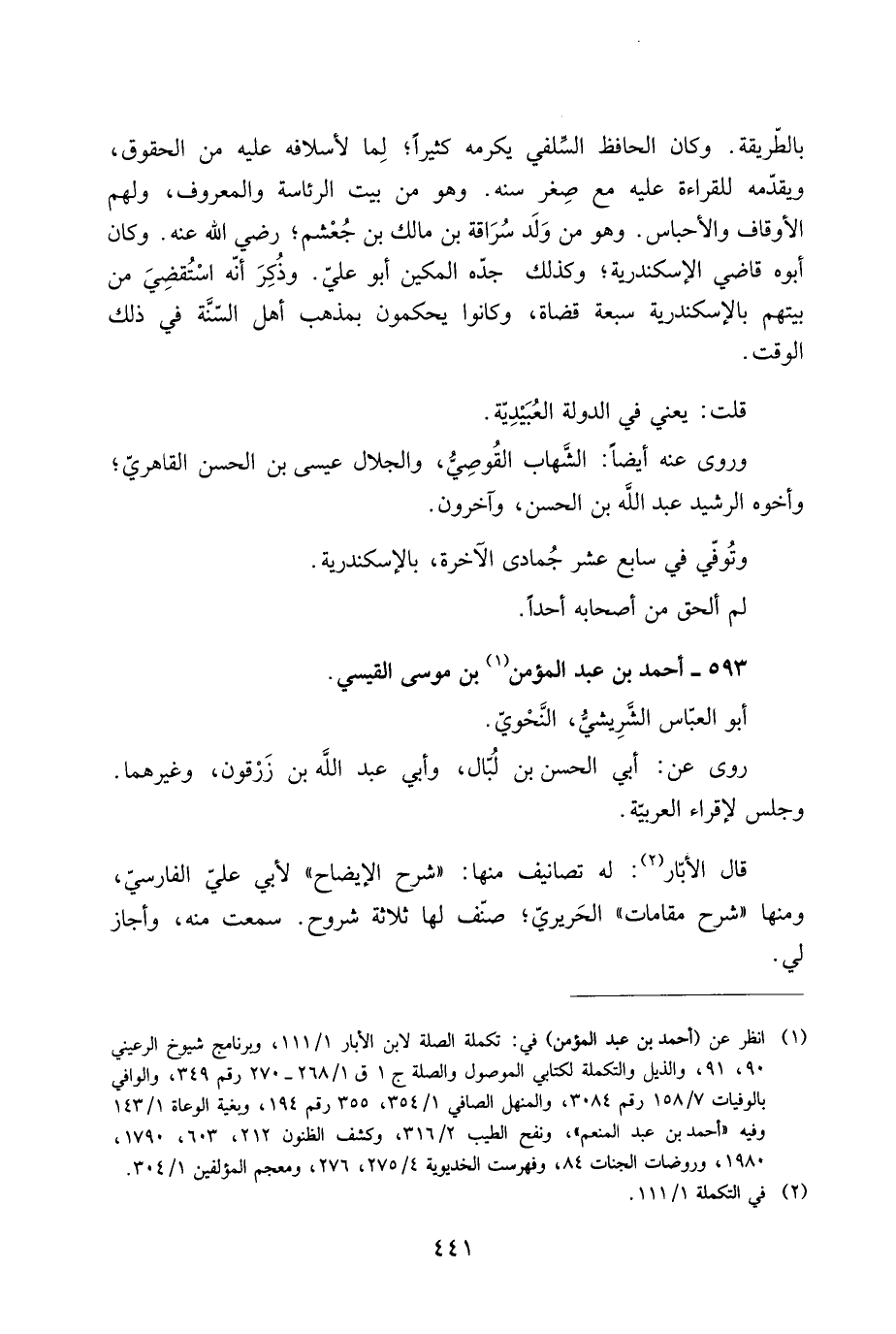 [1] انظر عن (أحمد بن عبد المؤمن) في: تكملة الصلة لابن الأبار 1/ 111، وبرنامج شيوخ الرعينيّ 90، 91، والذيل والتكملة لكتابي الموصول والصلة ج 1 ق 1/ 268- 270 رقم 349، والوافي بالوفيات 7/ 158 رقم 3084، والمنهل الصافي 1/ 354، 355 رقم 194، وبغية الوعاة 1/ 143 وفيه «أحمد بن عبد المنعم» ، ونفح الطيب 2/ 316، وكشف الظنون 212، 603، 1790، 1980، وروضات الجنات 84، وفهرست الخديوية 4/ 275، 276، ومعجم المؤلفين 1/ 304.