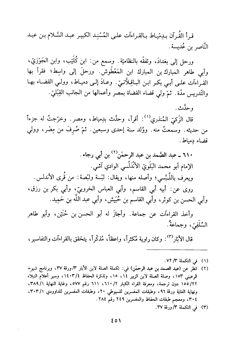 [2] انظر عن (عبد الصمد بن عبد الرحمن) في: تكملة الصلة لابن الأبار 3/ ورقة 37، وبرنامج شيوخ الرعينيّ 153، وصلة الصلة لابن الزبير 14، 15، وتذكرة الحفاظ 4/ 1403، وسير أعلام النبلاء 22/ 155 دون ترجمة، ومعرفة القراء الكبار 2/ 610، 611 رقم 577، وغاية النهاية 1/ 389، ونهاية الغاية ورقة 96، وطبقات المفسرين للسيوطي 20، وطبقات المفسرين للداوديّ 1/ 303، 304، ومعجم طبقات الحفاظ والمفسرين 249 رقم 284.