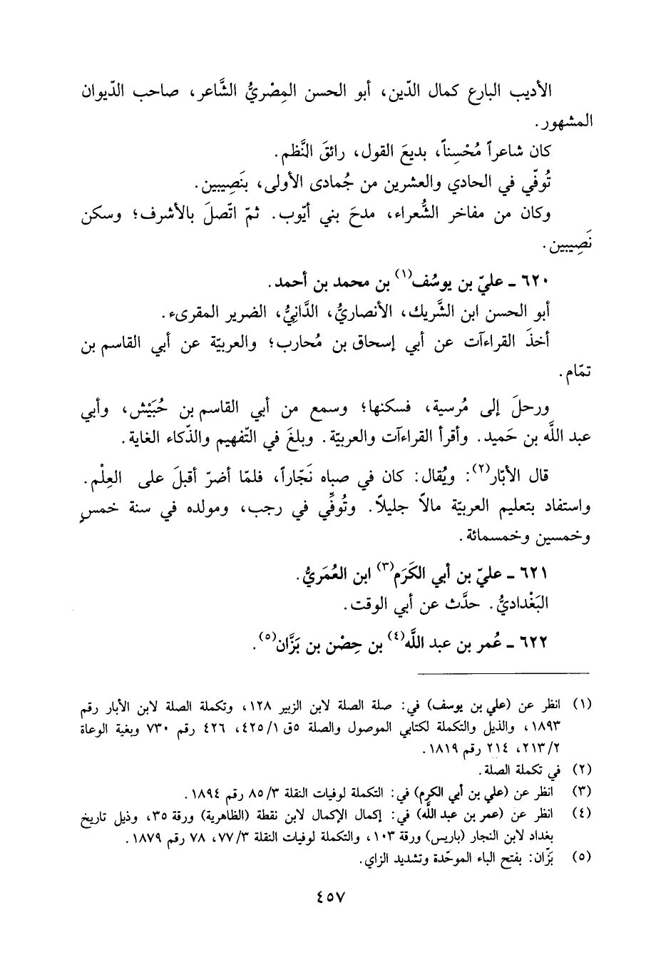 [4] انظر عن (عمر بن عبد الله) في: إكمال الإكمال لابن نقطة (الظاهرية) ورقة 35، وذيل تاريخ بغداد لابن النجار (باريس) ورقة 103، والتكملة لوفيات النقلة 3/ 77، 78 رقم 1879.